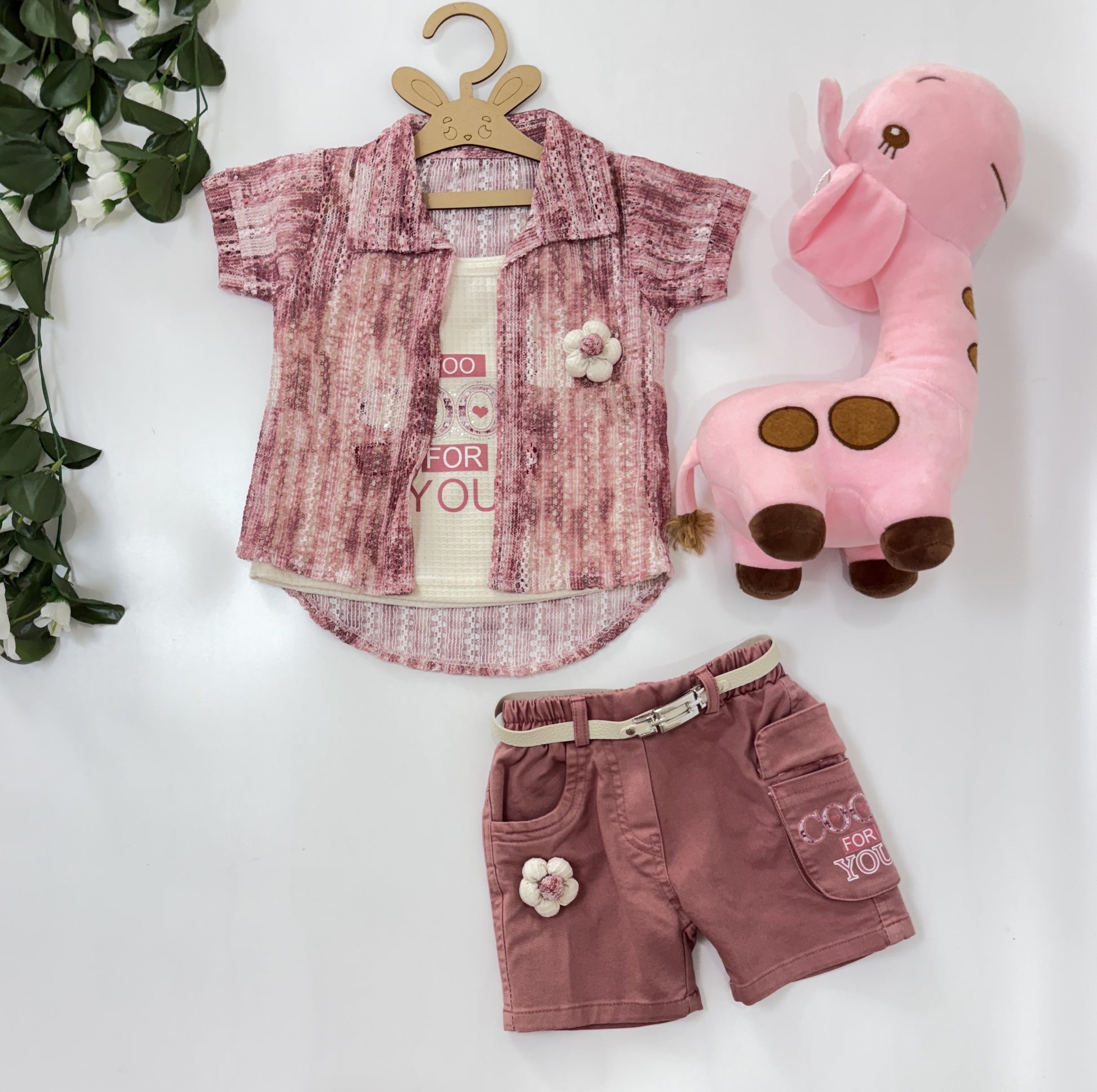 Bring playful charm and comfort to your little one’s wardrobe. Featuring a soft graphic tee, an open-front printed shirt, and matching shorts, this outfit is all about cute details, like the dainty floral appliqués and a sleek belt for added flair.