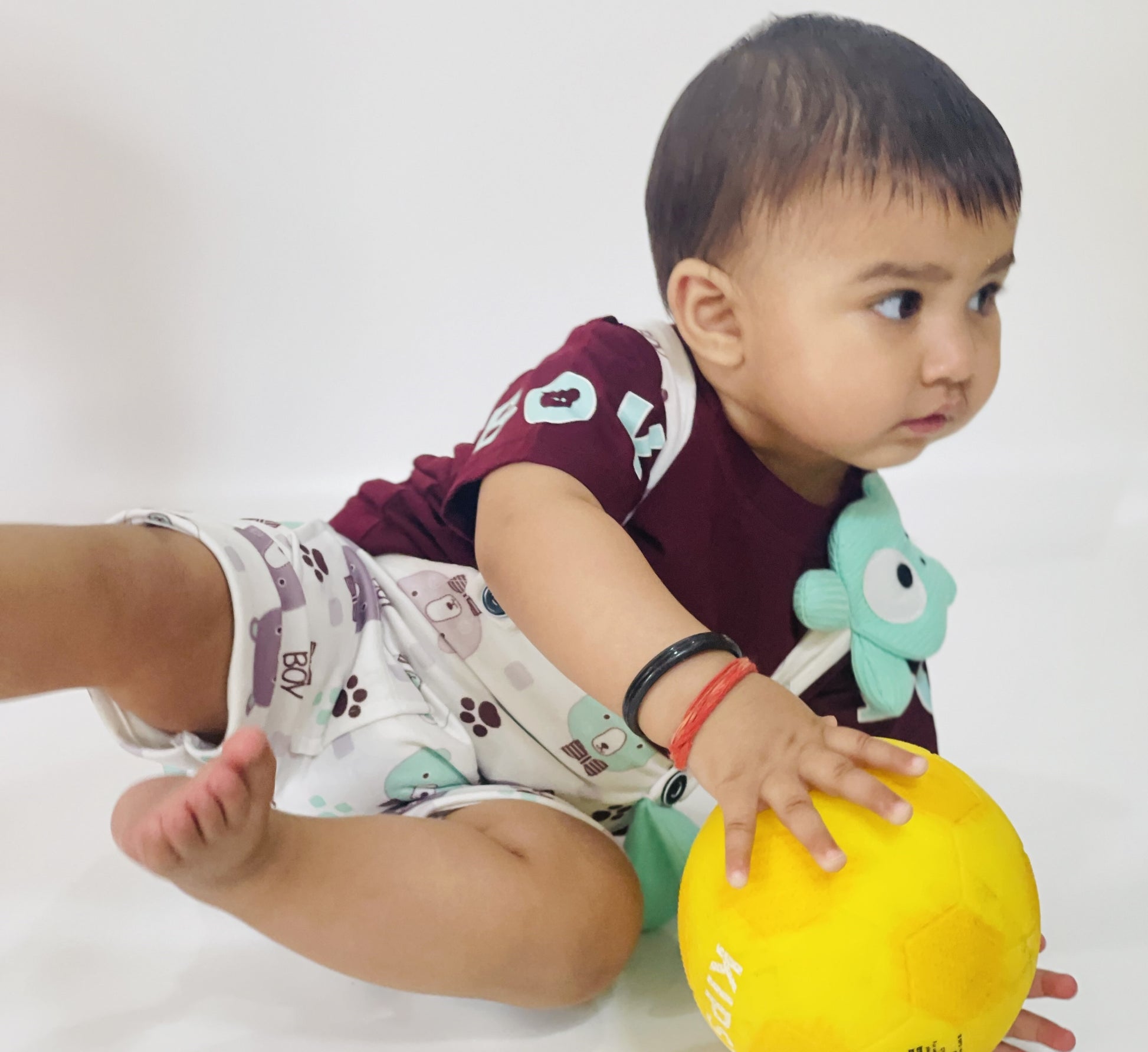 Brighten up your little boy's day with our Bear Squad Maroon Tee & Dungaree Set , a playful and cozy outfit perfect for everyday fun . this 2 - piece combo features a solid navy blue t-shirt with bold " BOY" prints on the sleeves , paired with adorable white dungarees covered in a cheerful bear face pattern in soft pastels tones.