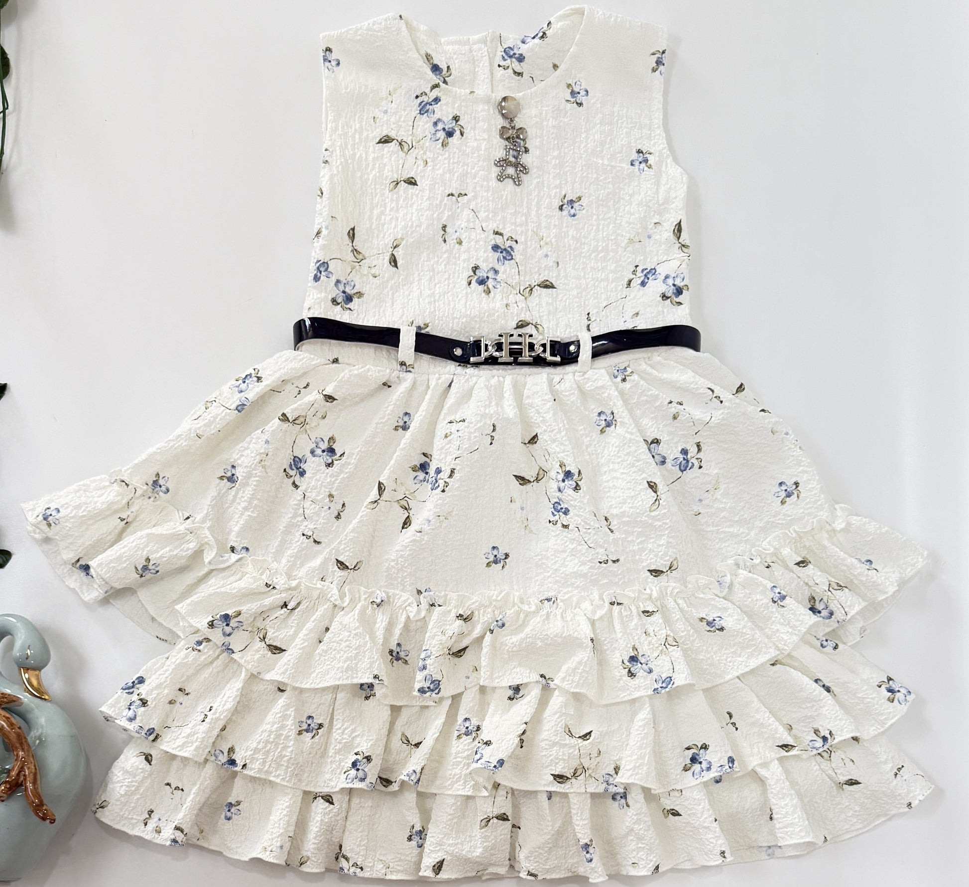 Frock Dress | White Floral Ruffle Frock with Belt | Girls Dress