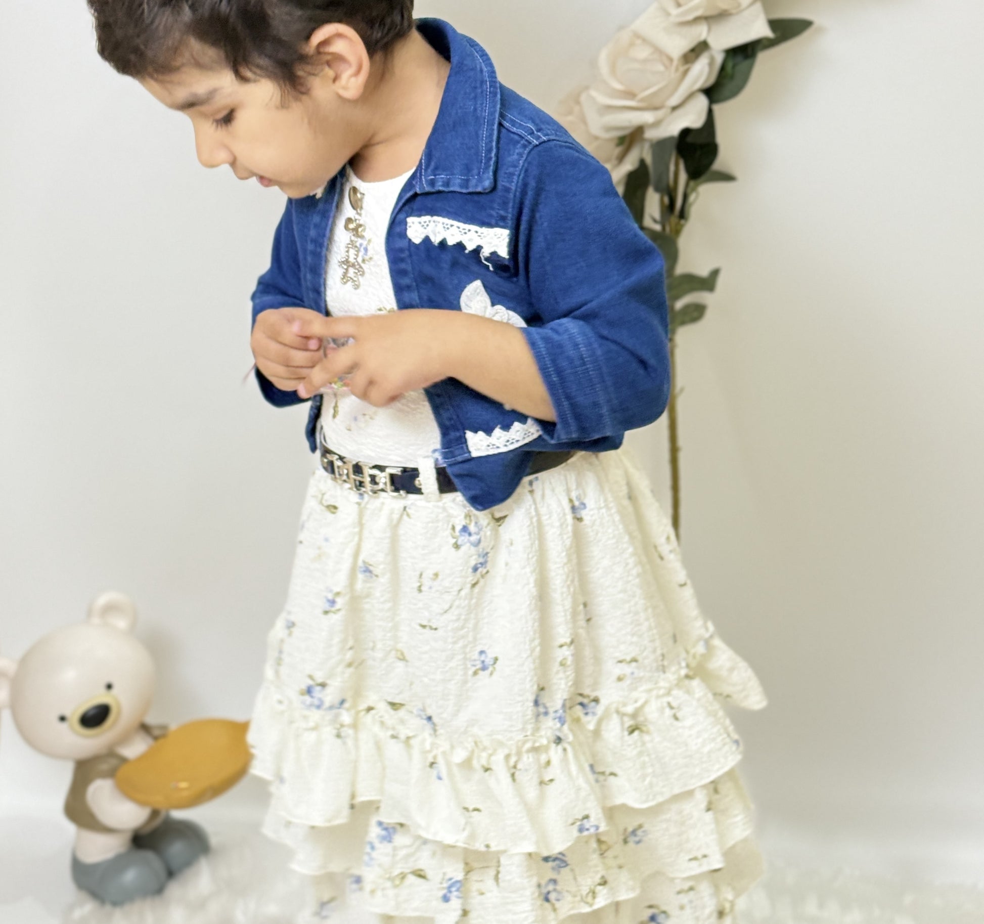 Accented with a sleek black belt featuring a metallic buckle, this frock blends sweetness with sophistication. Whether it’s a birthday party, family gathering, or a festive celebration, this dress is sure to make your little girl feel extra special.