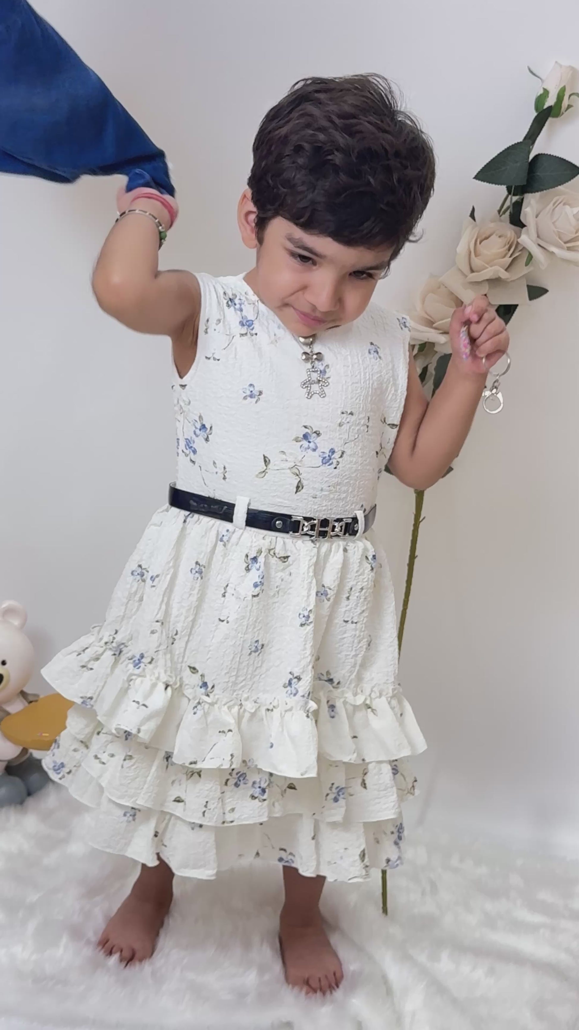 Add a touch of elegance to your little one’s wardrobe with our White Floral Ruffle Frock with Belt. This sleeveless dress features an all-over soft blue floral print on textured crinkle fabric, offering a charming and timeless look. The layered ruffle skirt adds volume and playful flair, making it perfect for twirling around at any occasion.
