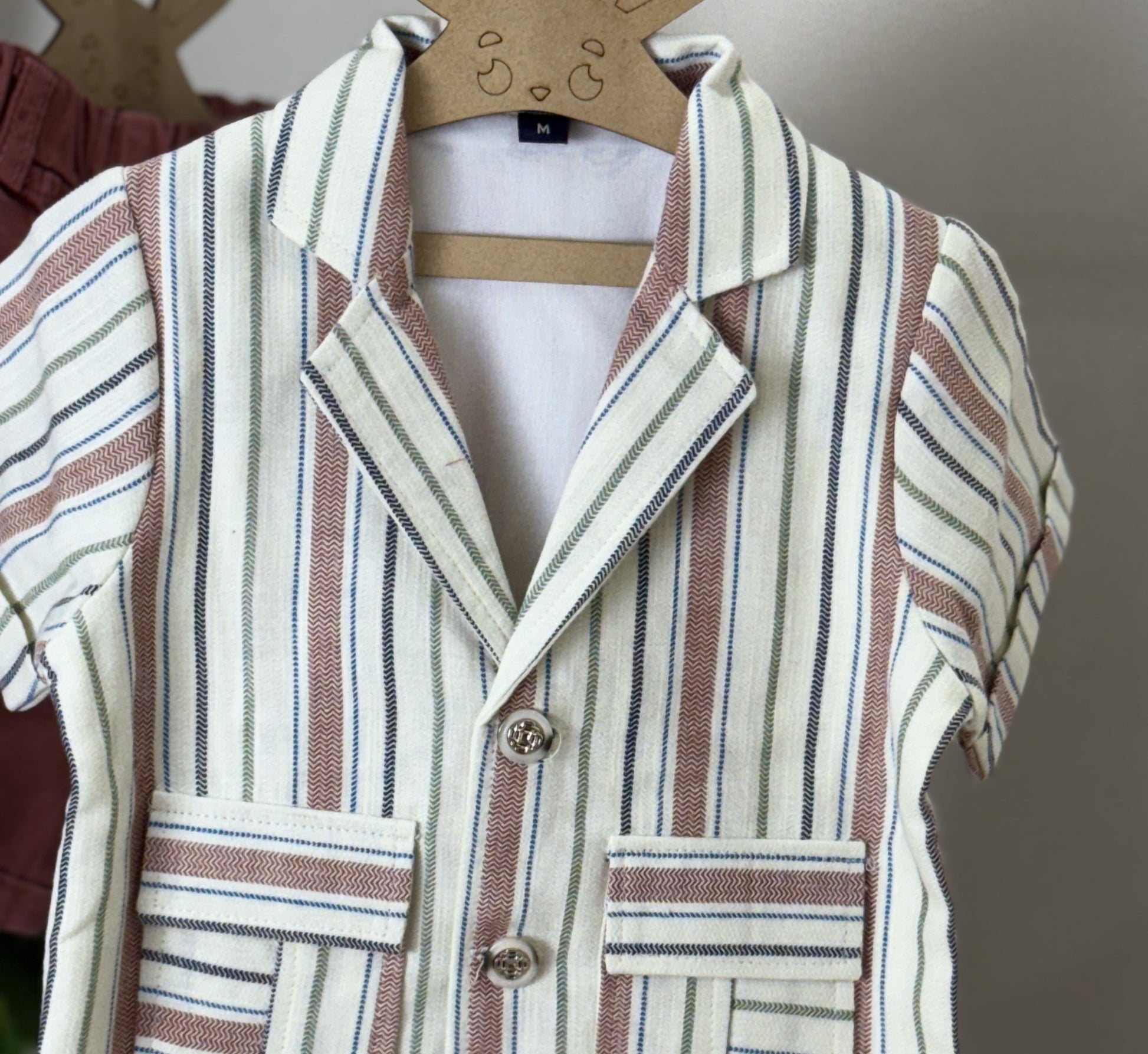 Add a cool, smart-casual vibe to your little boy’s wardrobe with this stylish 3-piece outfit set. Featuring a sleeveless printed tank top, striped short-sleeve blazer, and rust-colored shorts, this ensemble strikes the perfect balance between playful and polished.