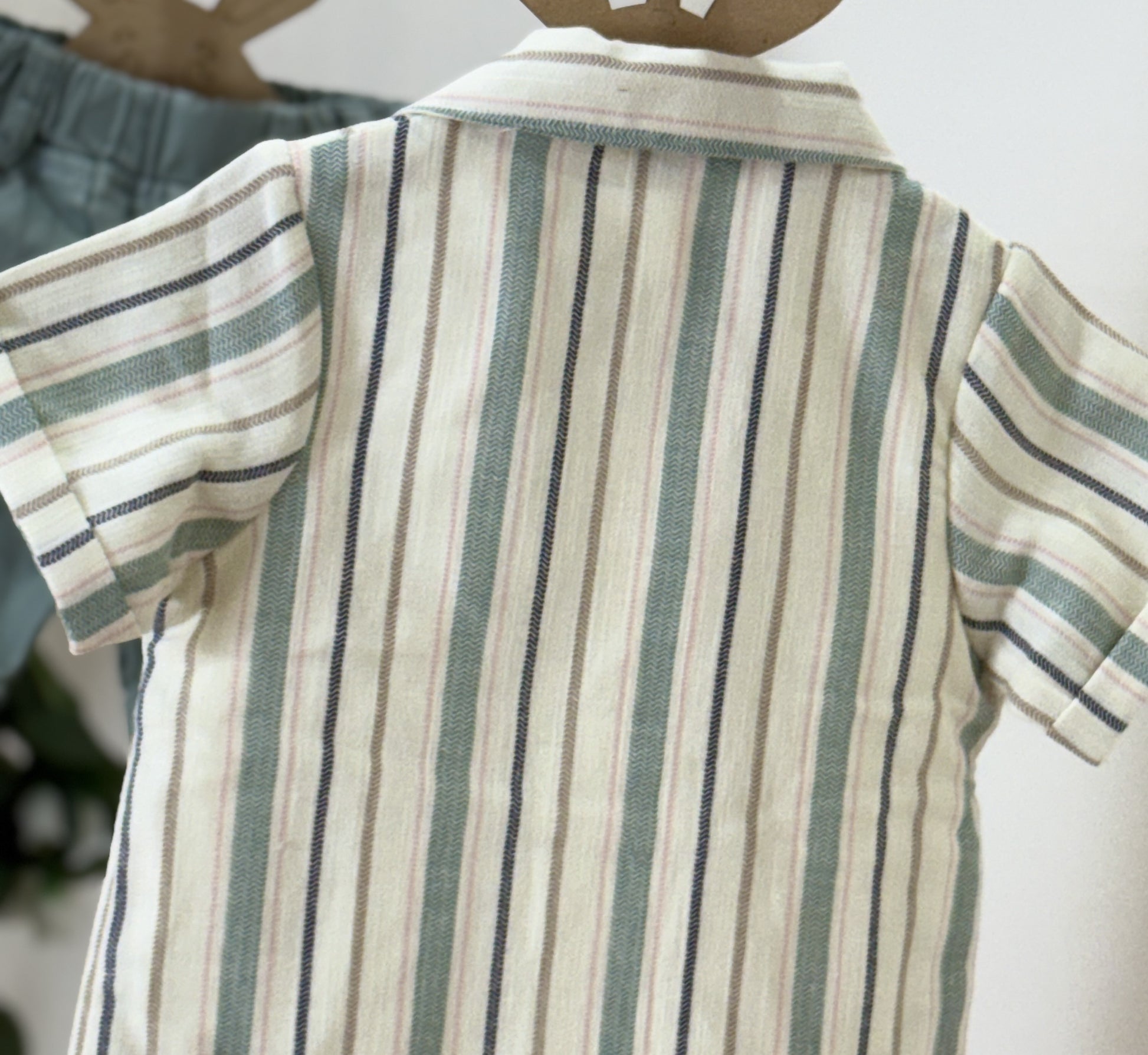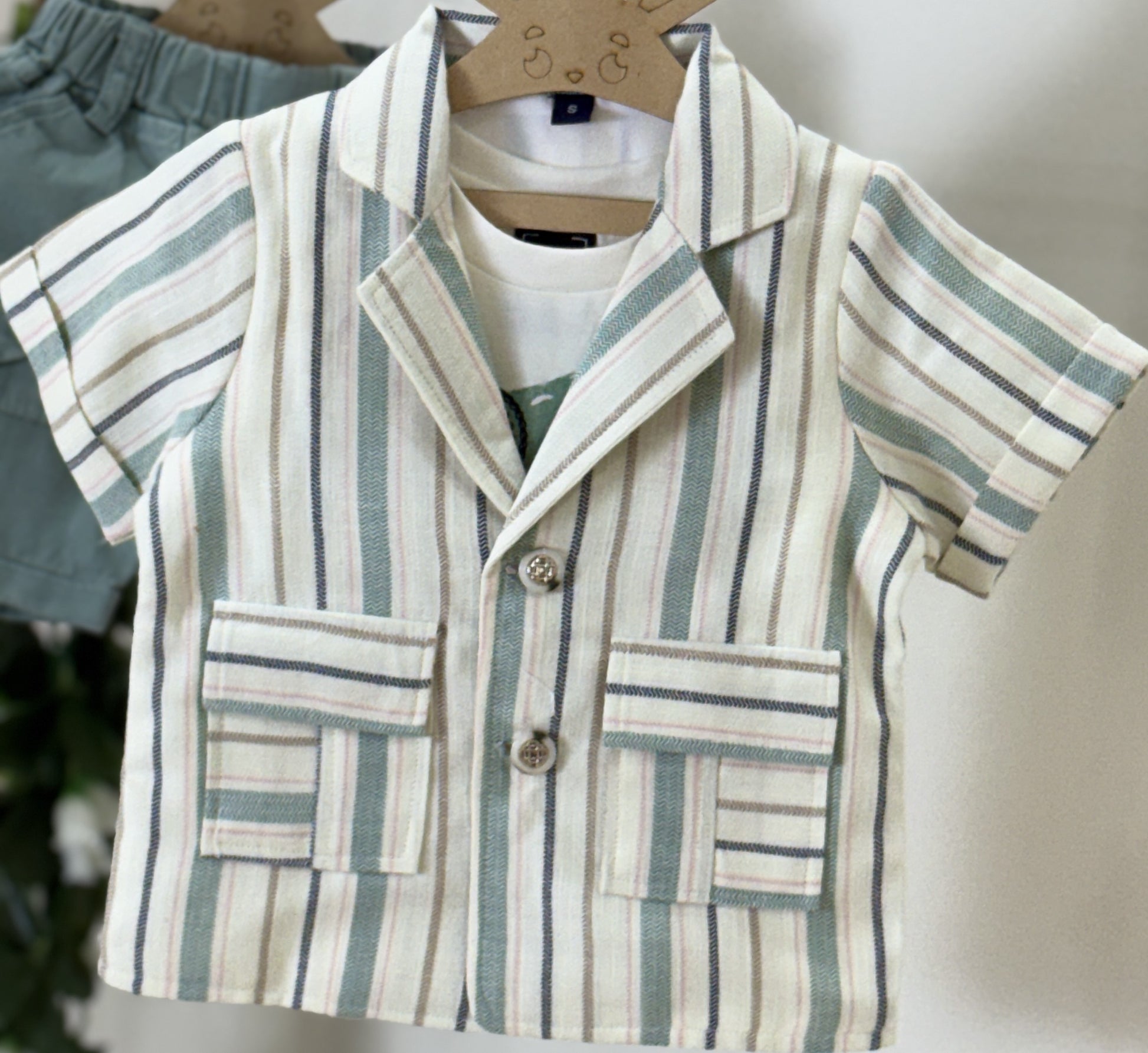 Add a cool , smart - casual vibe to your little boy's wardrobe with this stylish 3-piece outfit set . Featuring a sleeveless printed tank top , striped short-sleeve blazer , and light colour shorts , this ensemble strikes the perfect balance between playful and polished .