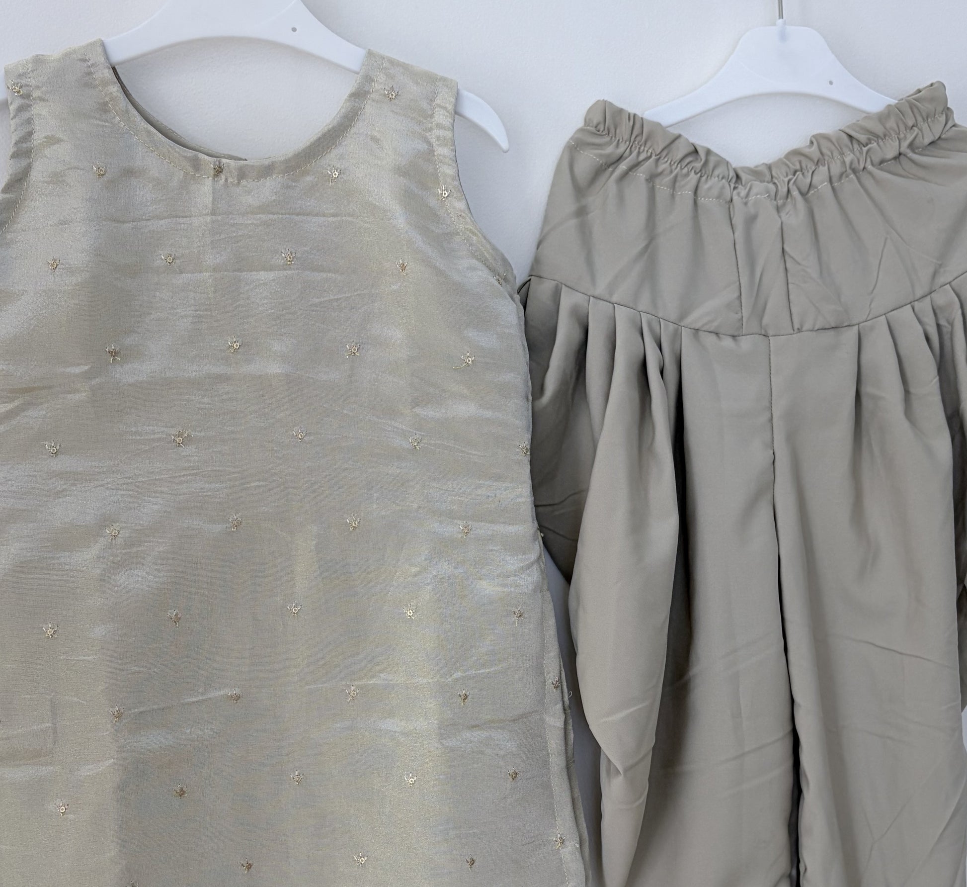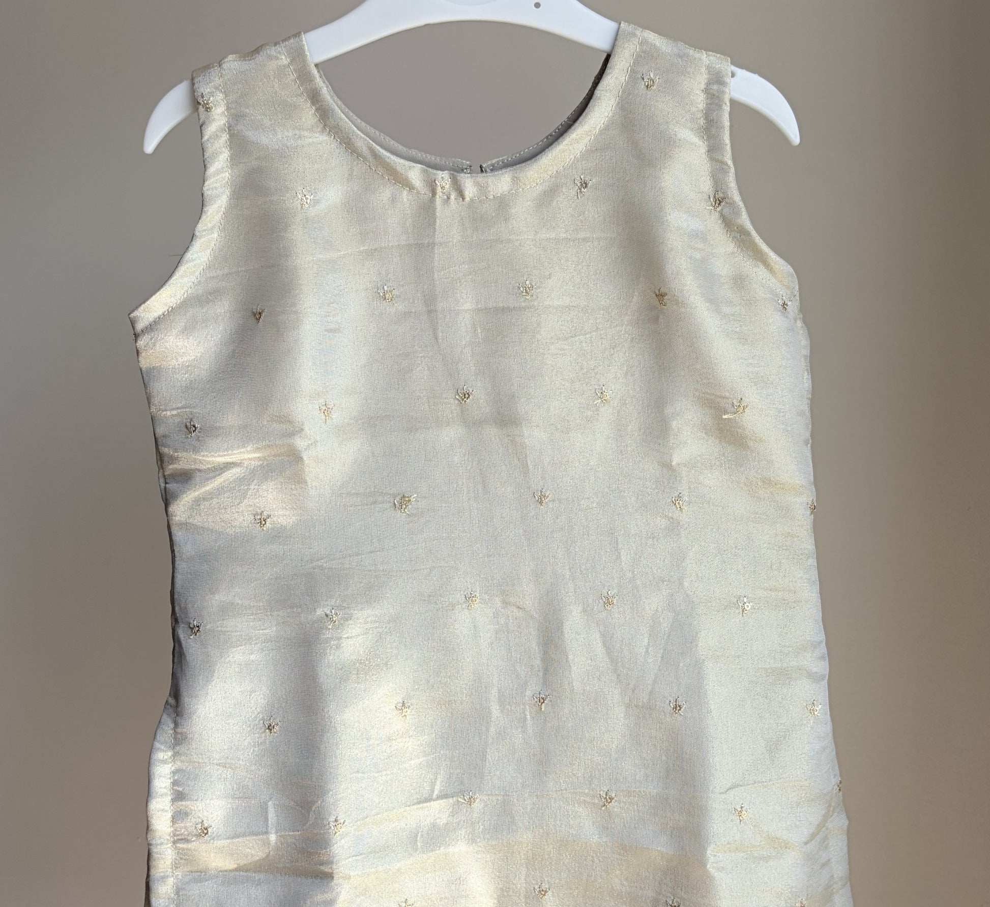 This stunning outfit features a sleeveless ivory top adorned with delicate gold embroidery, paired with flowy dhoti - style pants in a matching ivory hue. Perfect for festive occasions or ethnic- inspired gatherings. The top’s subtle gold accents add a touch of sophistication , while the dhoti pants bring a modern twist to traditional styling . Ideal for those who love blending classic charm with contemporary flair !