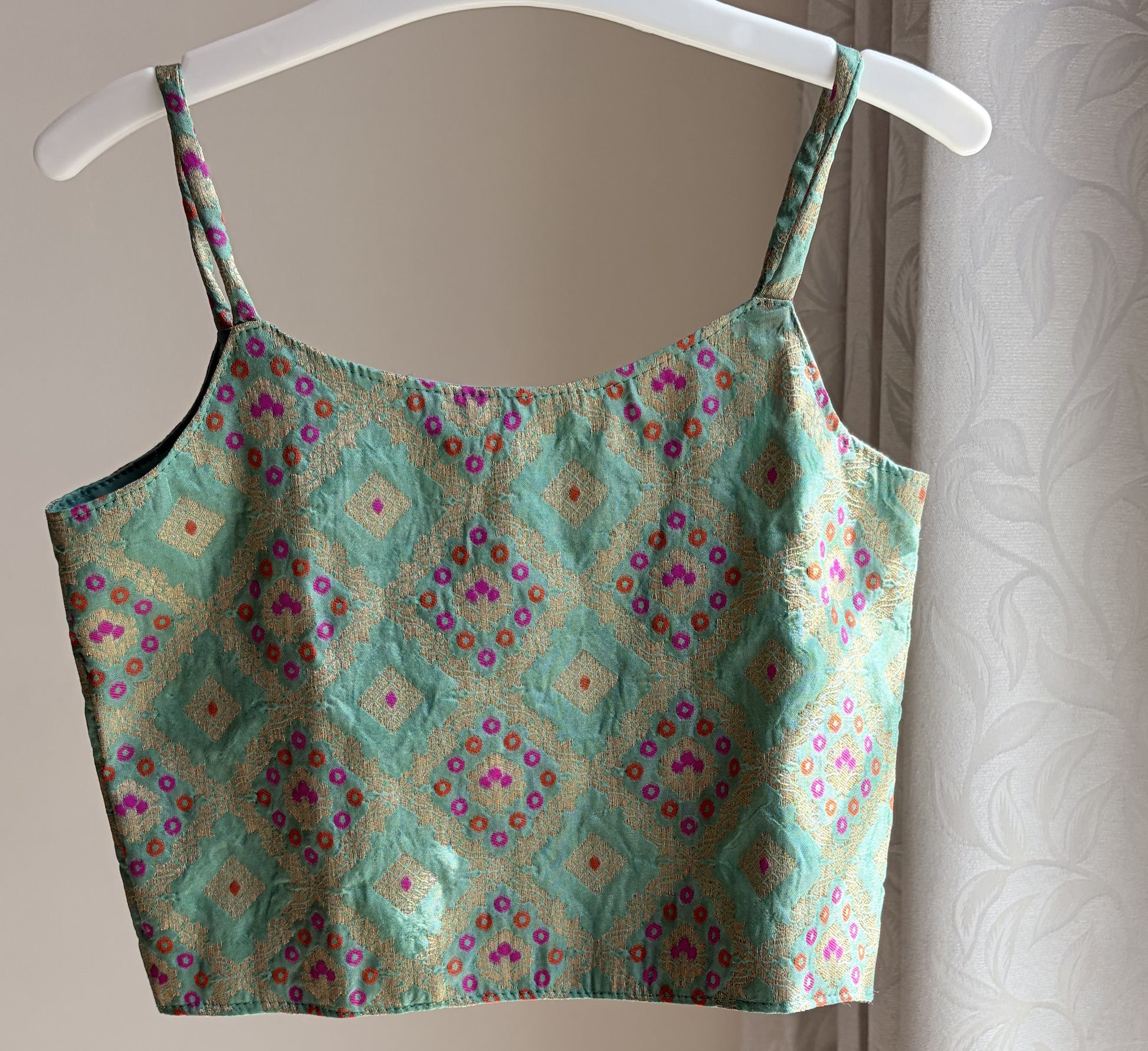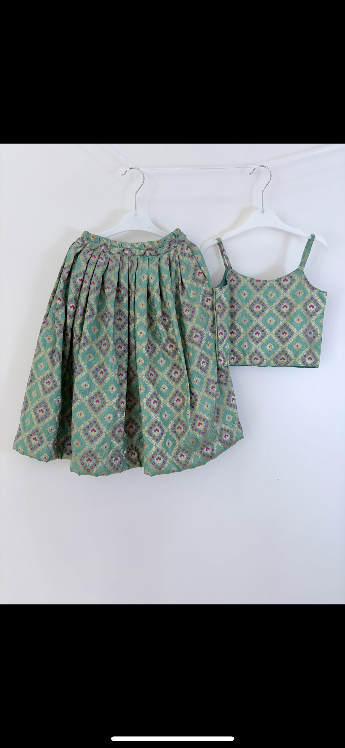 Elevate your festive look with this stunning turquoise lehenga choli set! 💃 Crafted with intricate gold , pink , and orange diamond patterns , this outfit is perfect for weddings , festivals or any celebration .