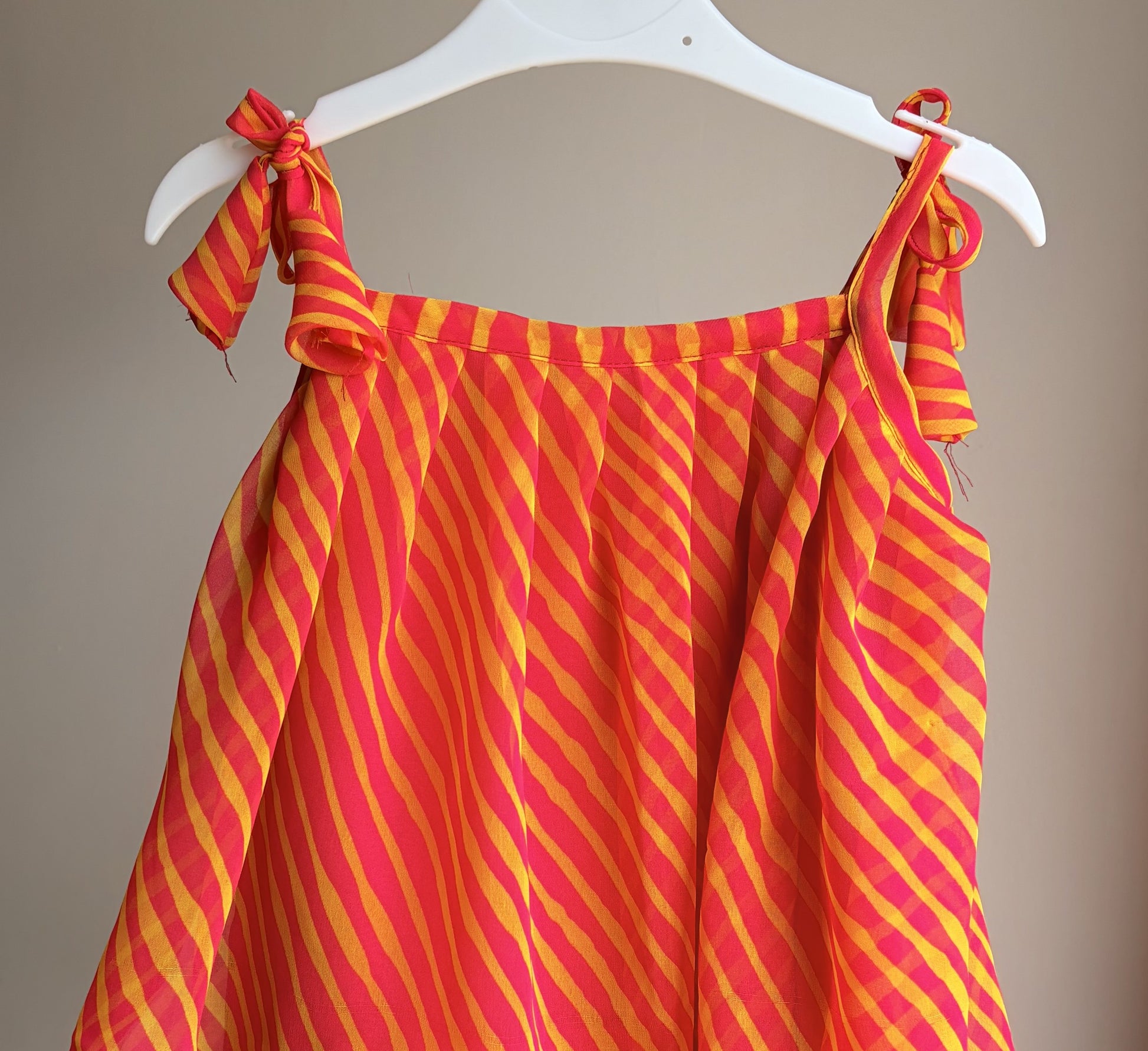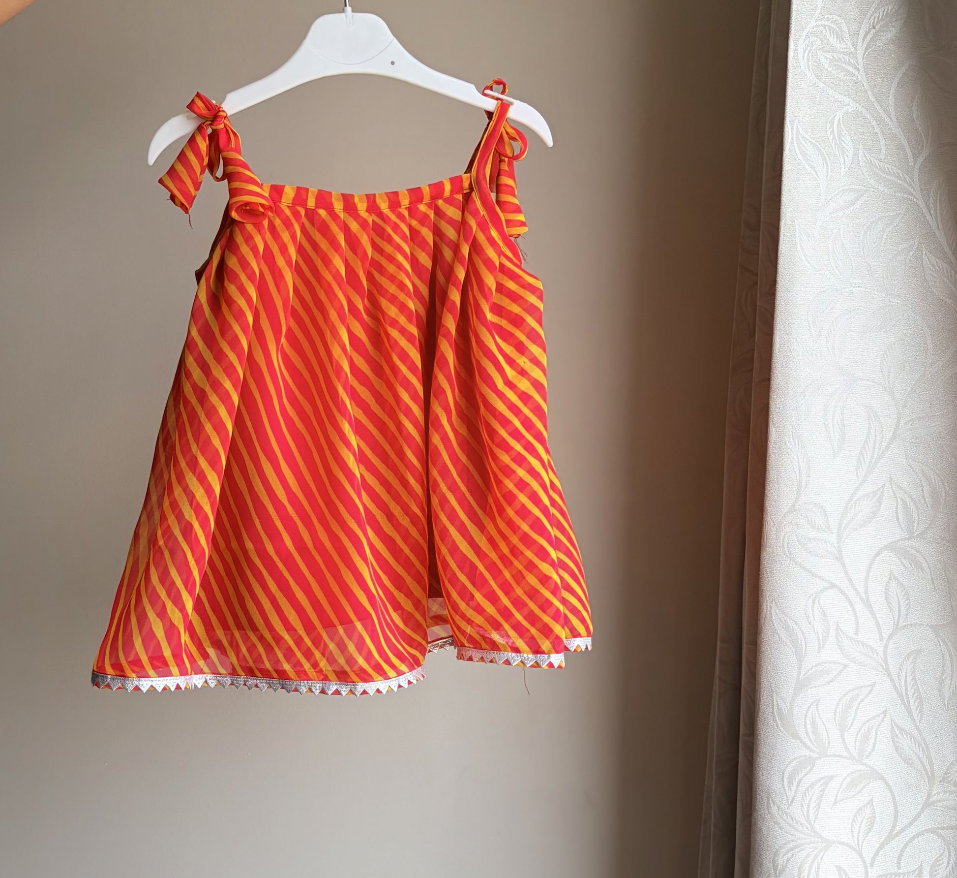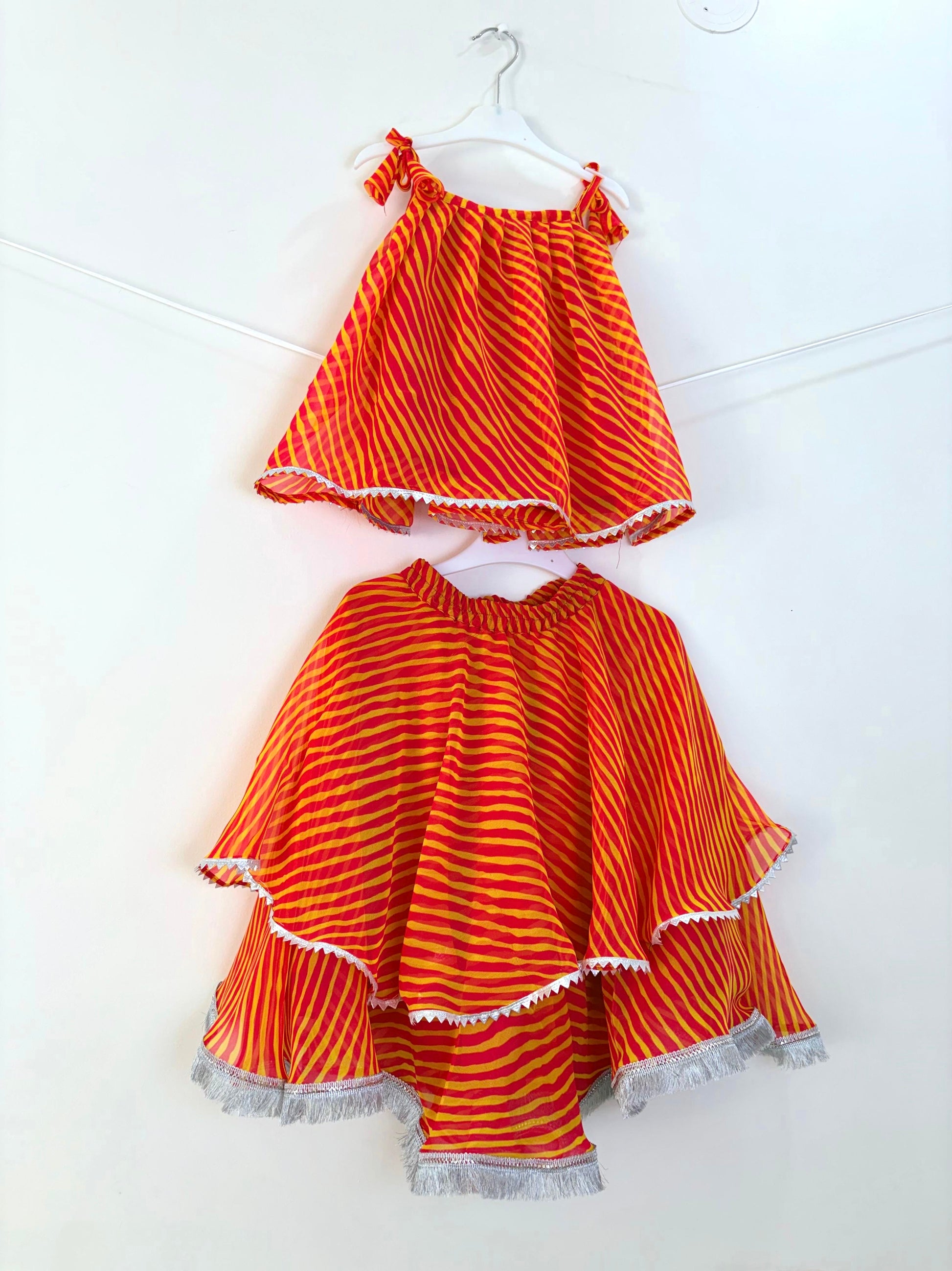 Perfect for Navratri or any festive occasion, this outfit features a flared top with tie-up straps and a gorgeous multi-layered skirt with white trims and tassels.