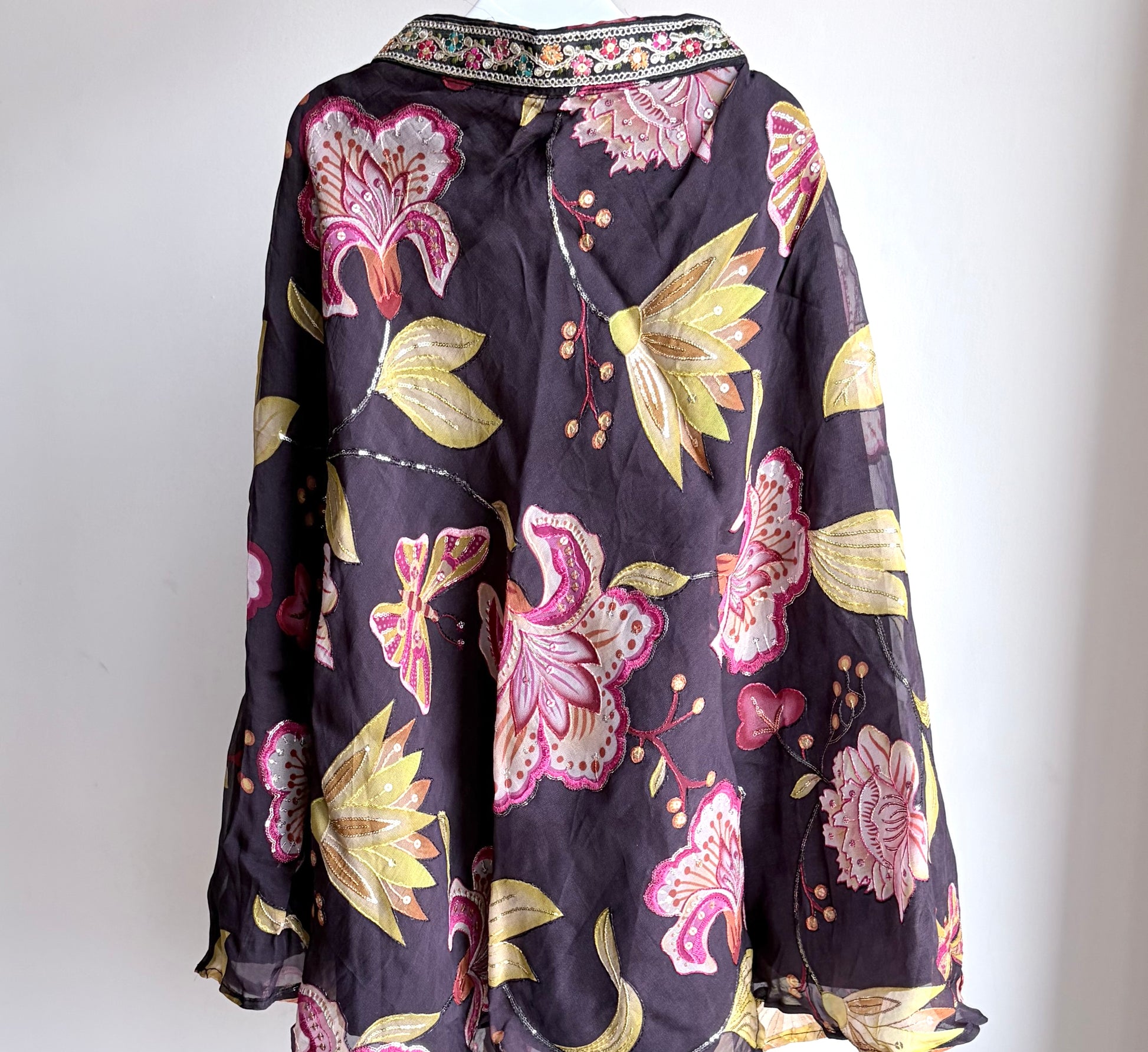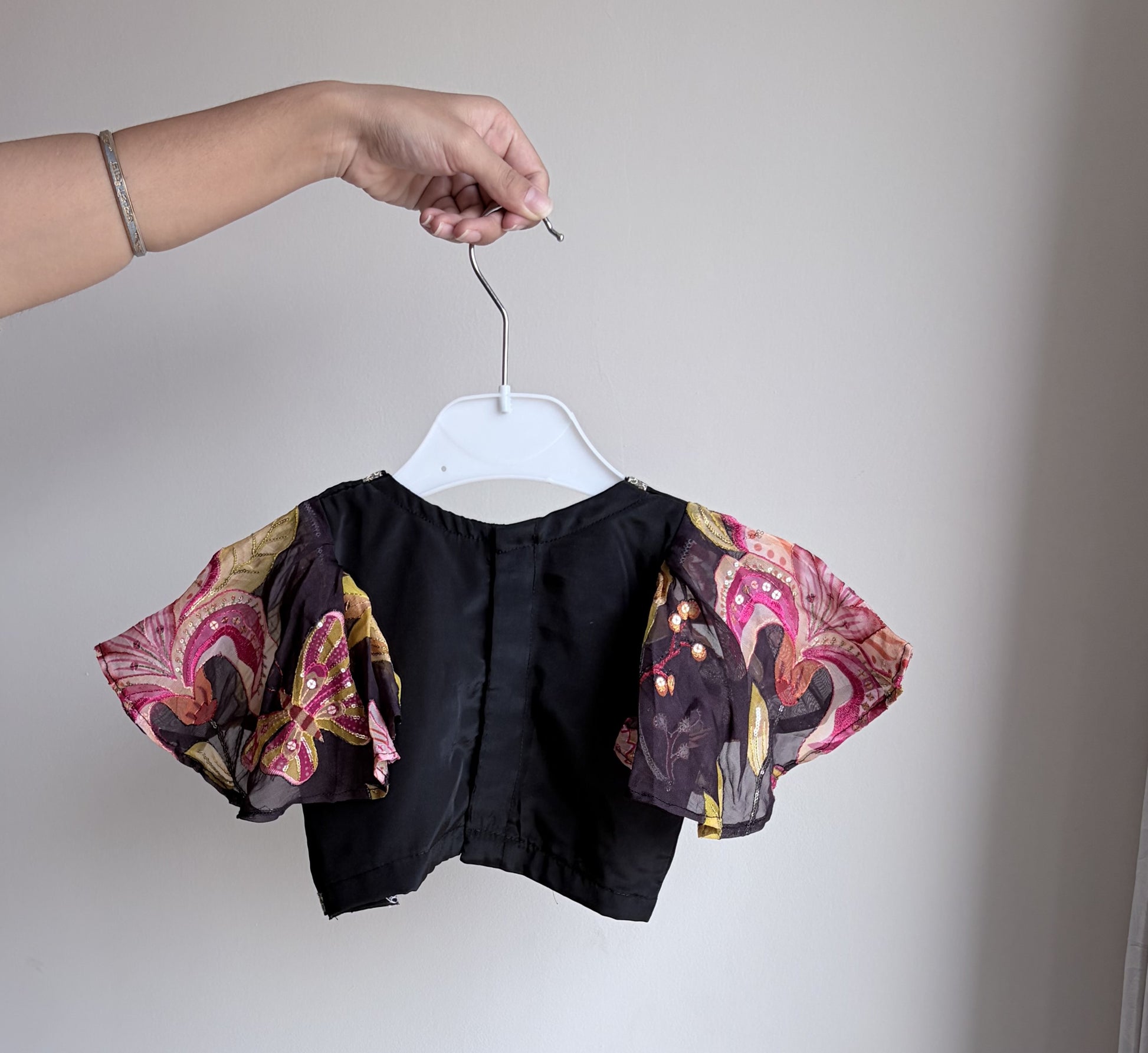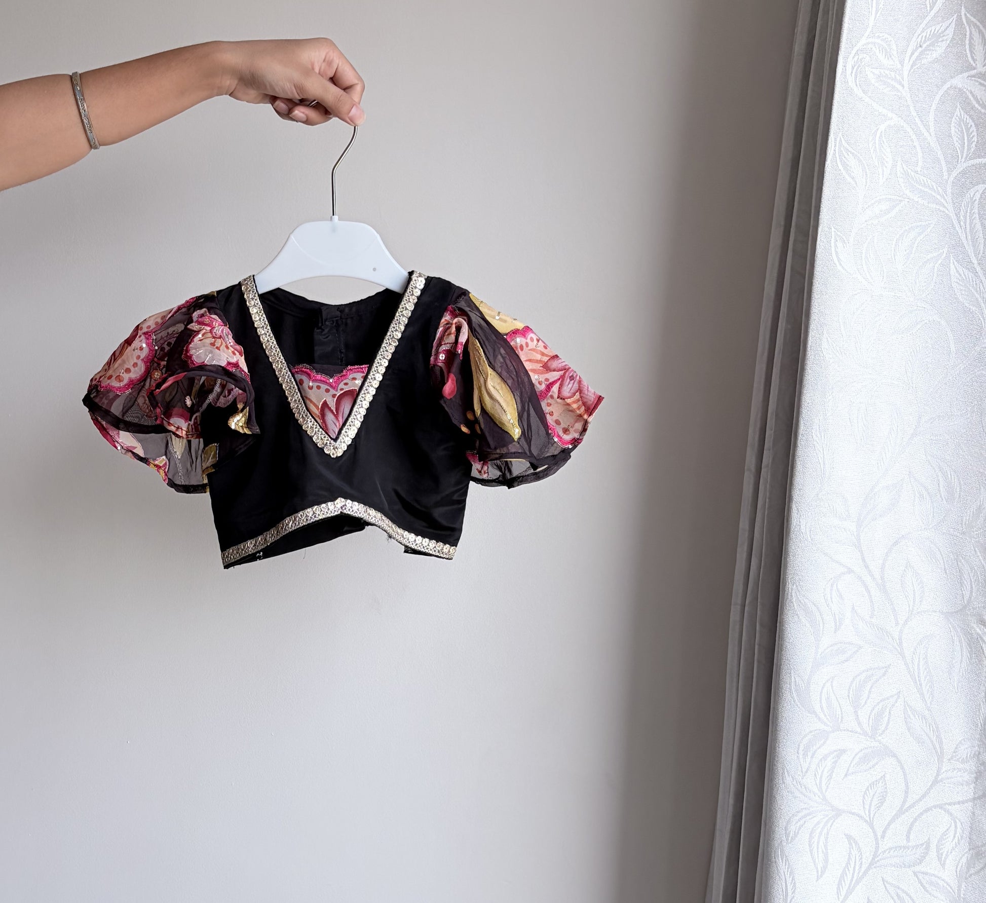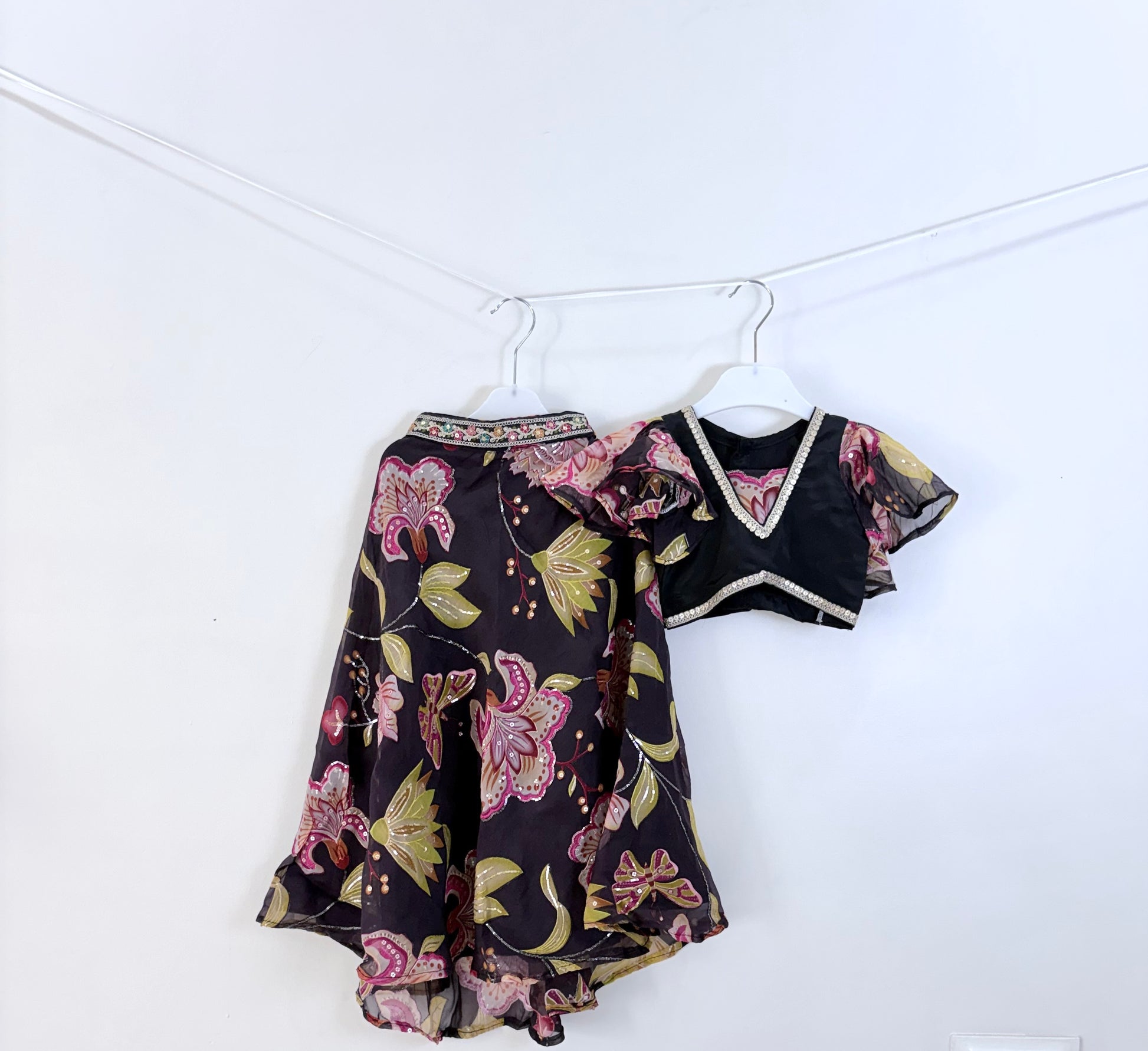 gorgeous floral print in shades of pink, yellow, and green on a sleek black base, with intricate detailing on the waistband. Paired with a chic black blouse featuring V-neckline and silver trim accents, this outfit is perfect for festivals, weddings, or any special occasion .