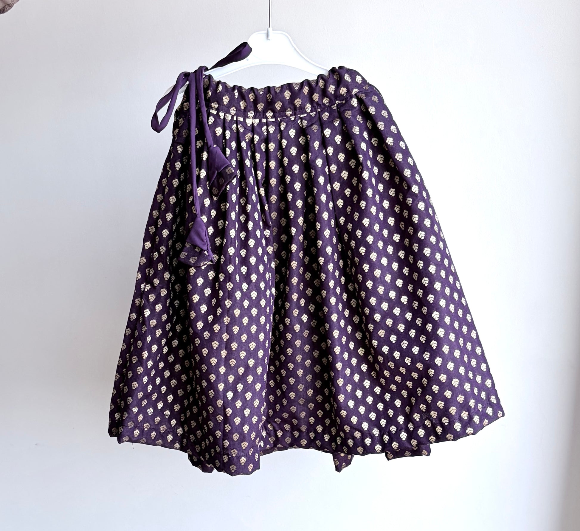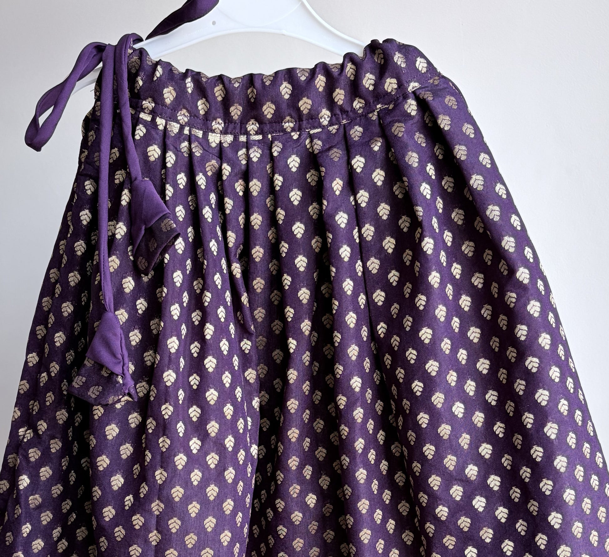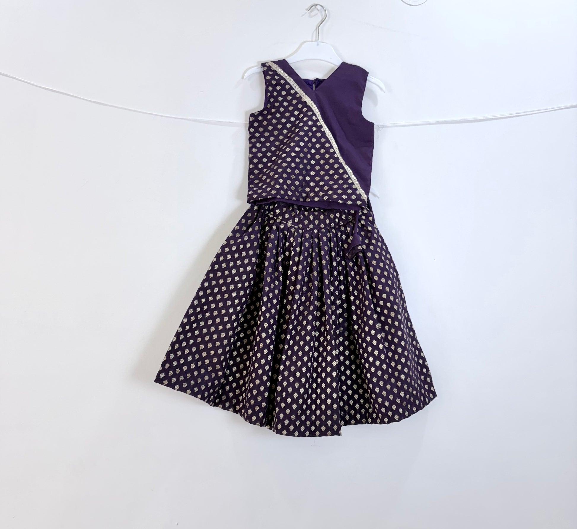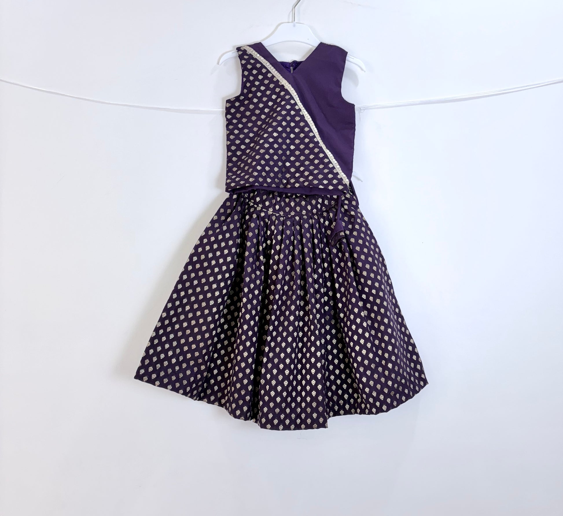 with a beautiful blend of solid purple and patterned fabric adorned with tiny gold motifs, this outfit is perfect for festive occasions or special celebrations.