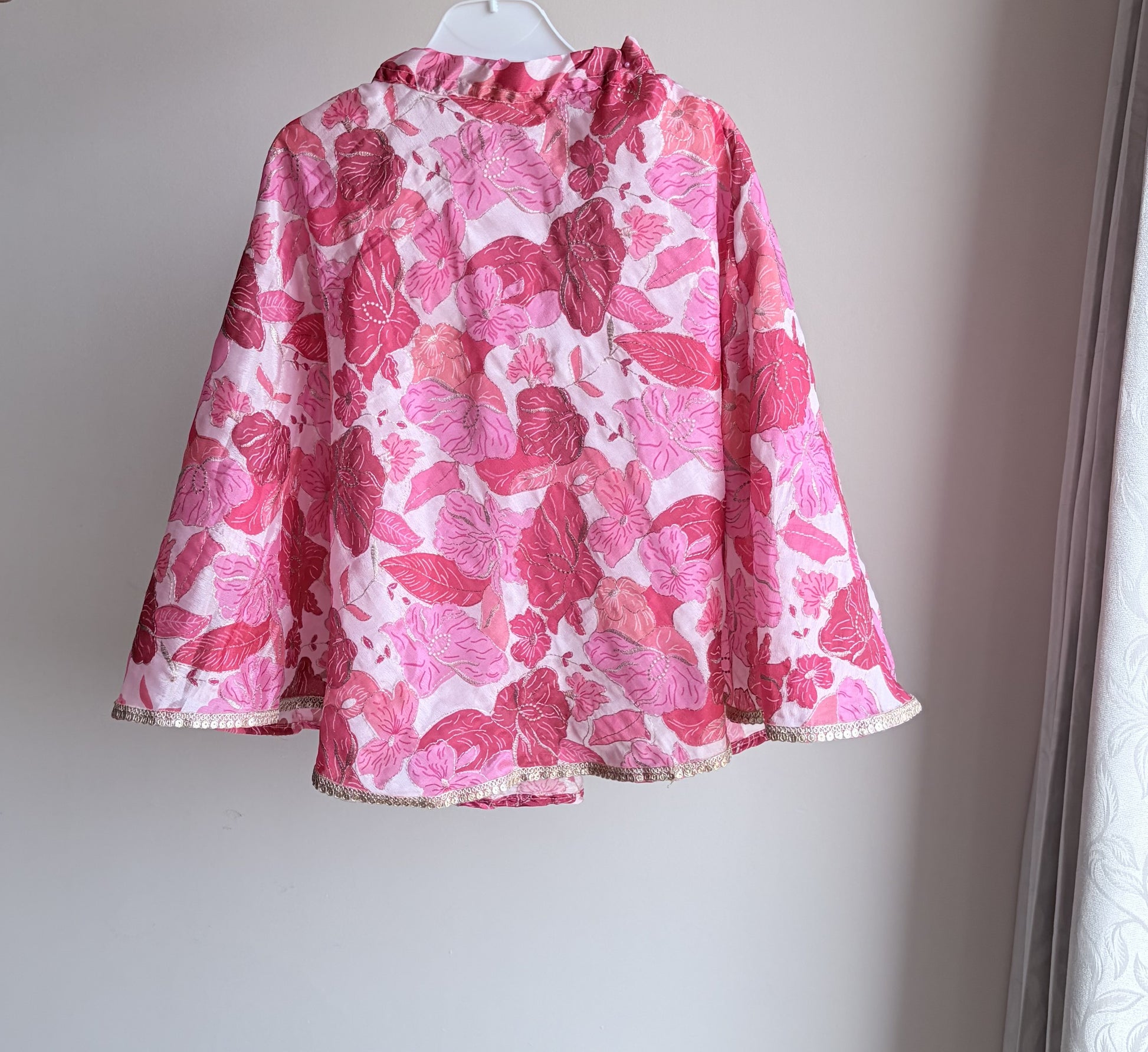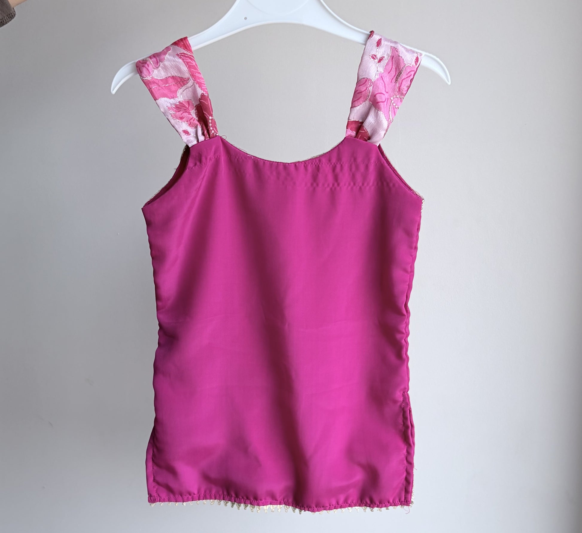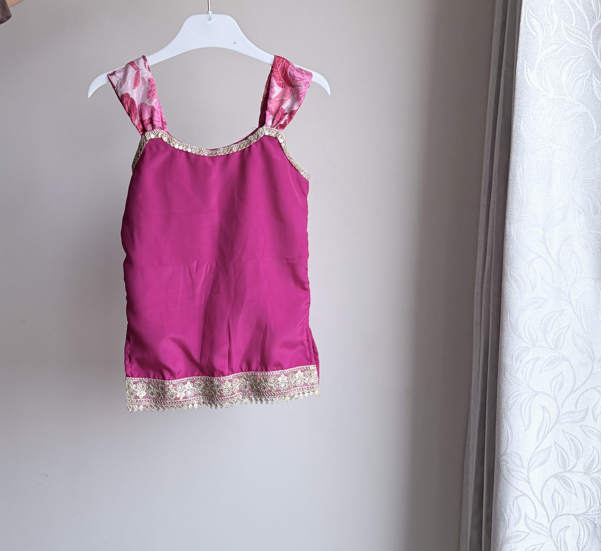 top with delicate gold trim pairs perfectly with a flowy pink skirt adorned with gorgeous floral patterns in shades of pink & red.