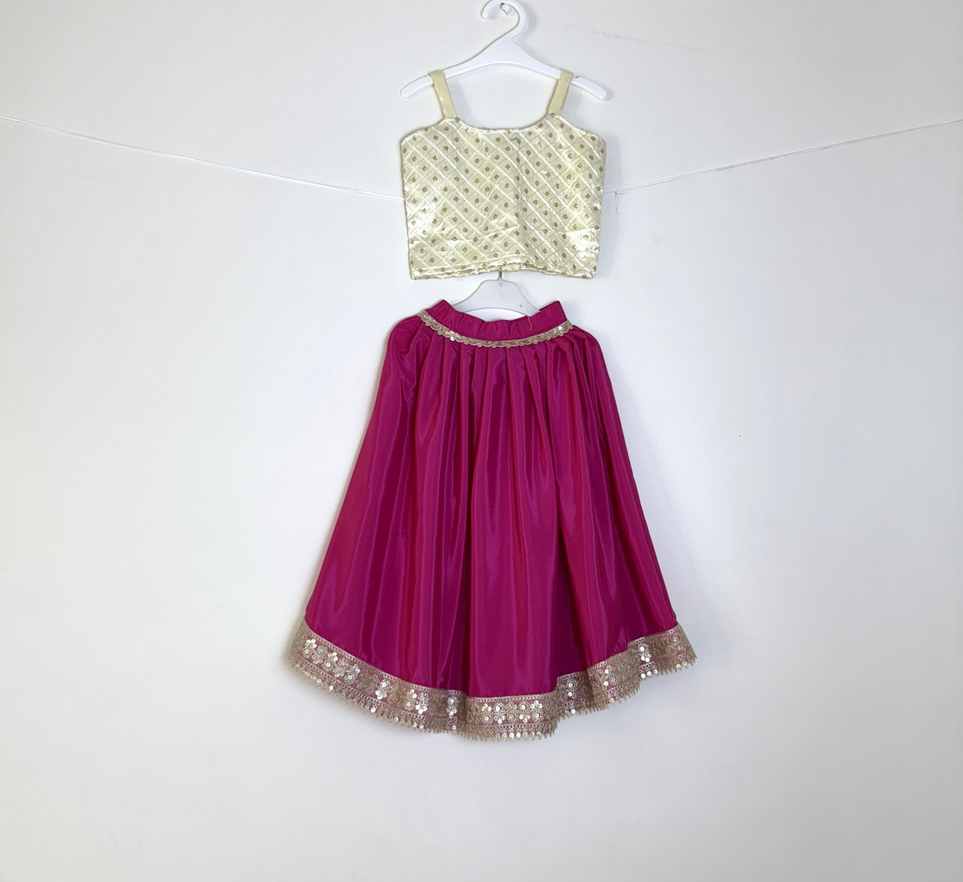 off-white top adorned with intricate gold embroidery and diagonal patterns with a vibrant pink skirt featuring gold lace trims. Perfect for festivals like Navratri, weddings, or any traditional celebration!