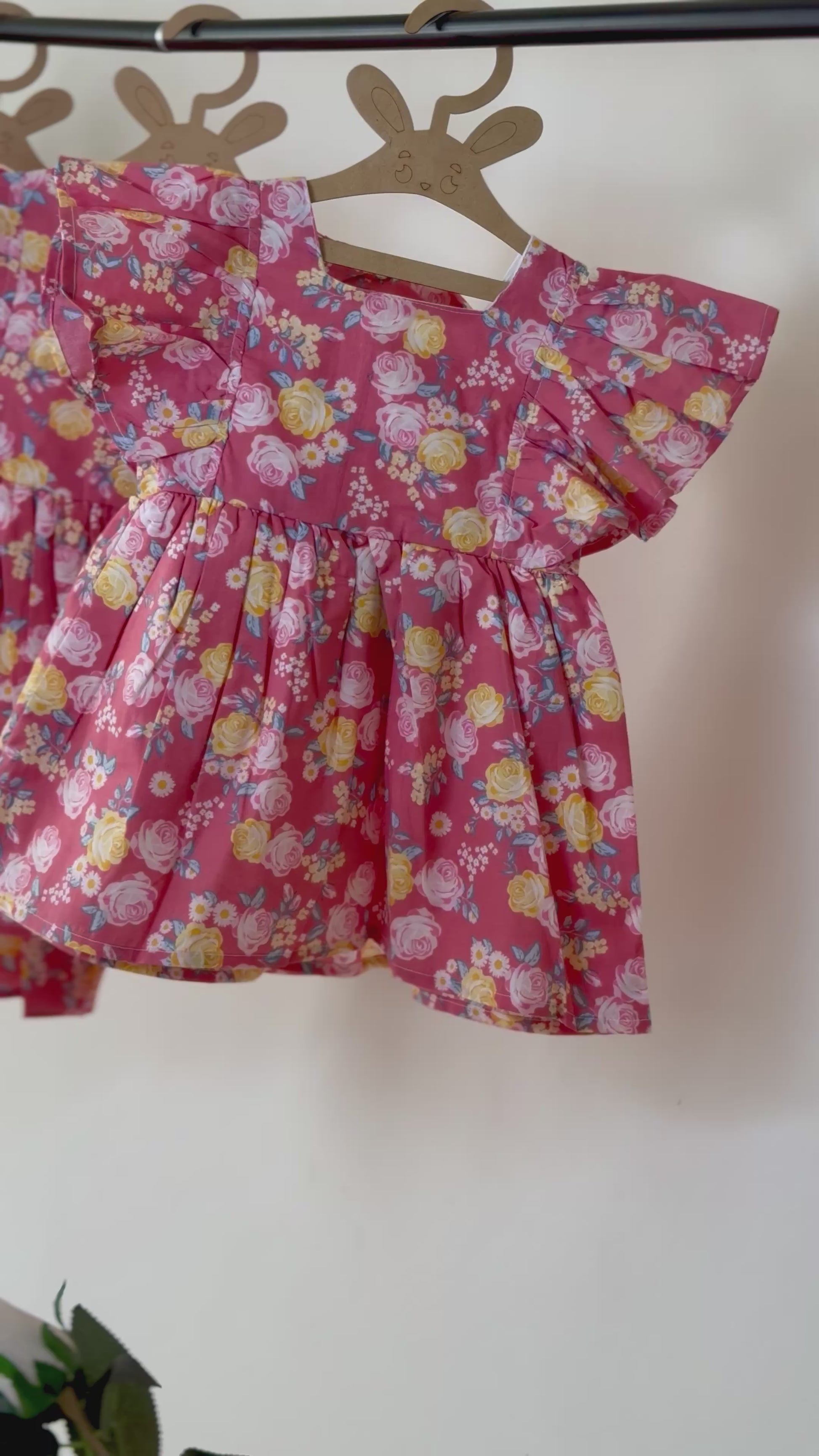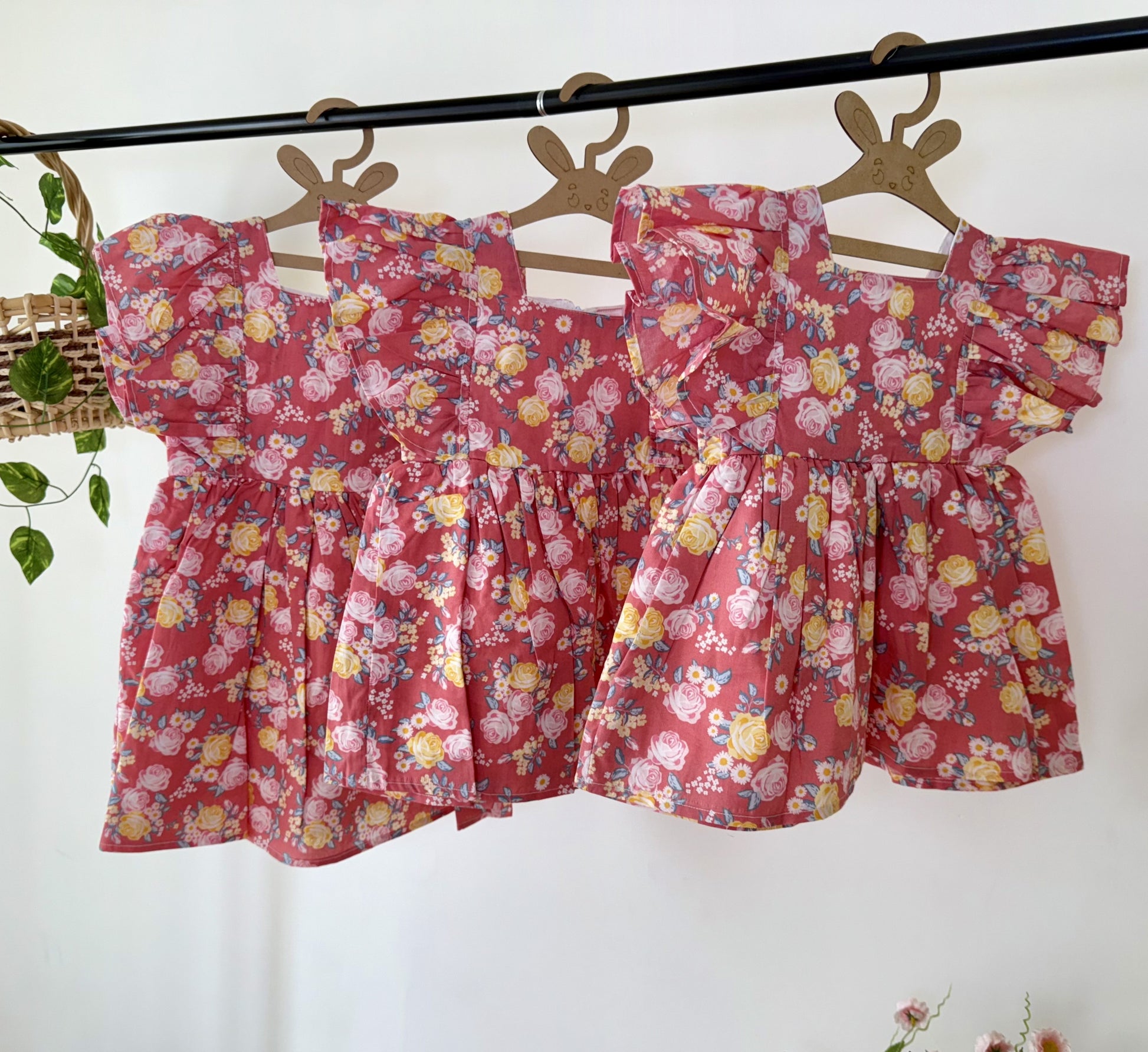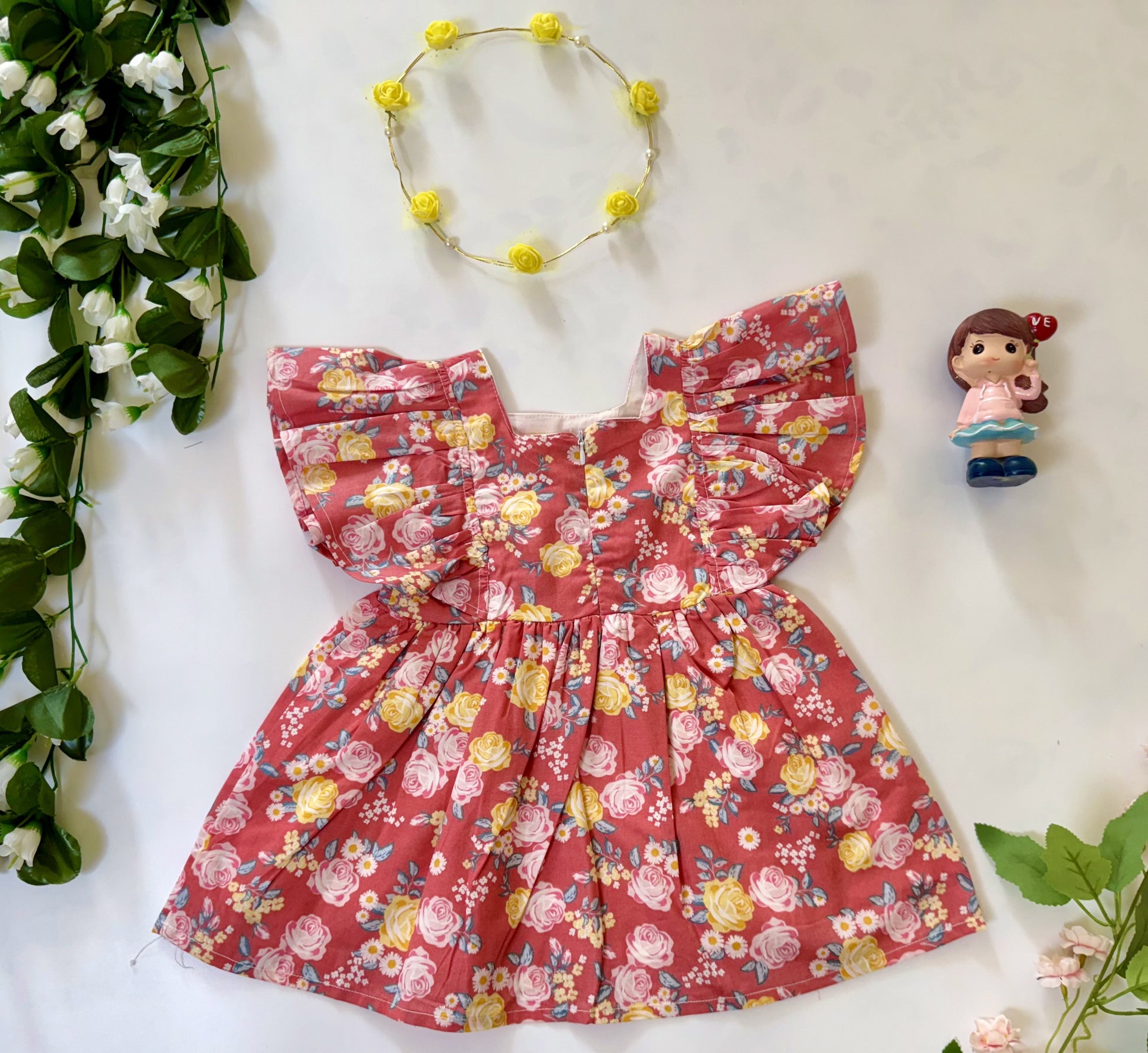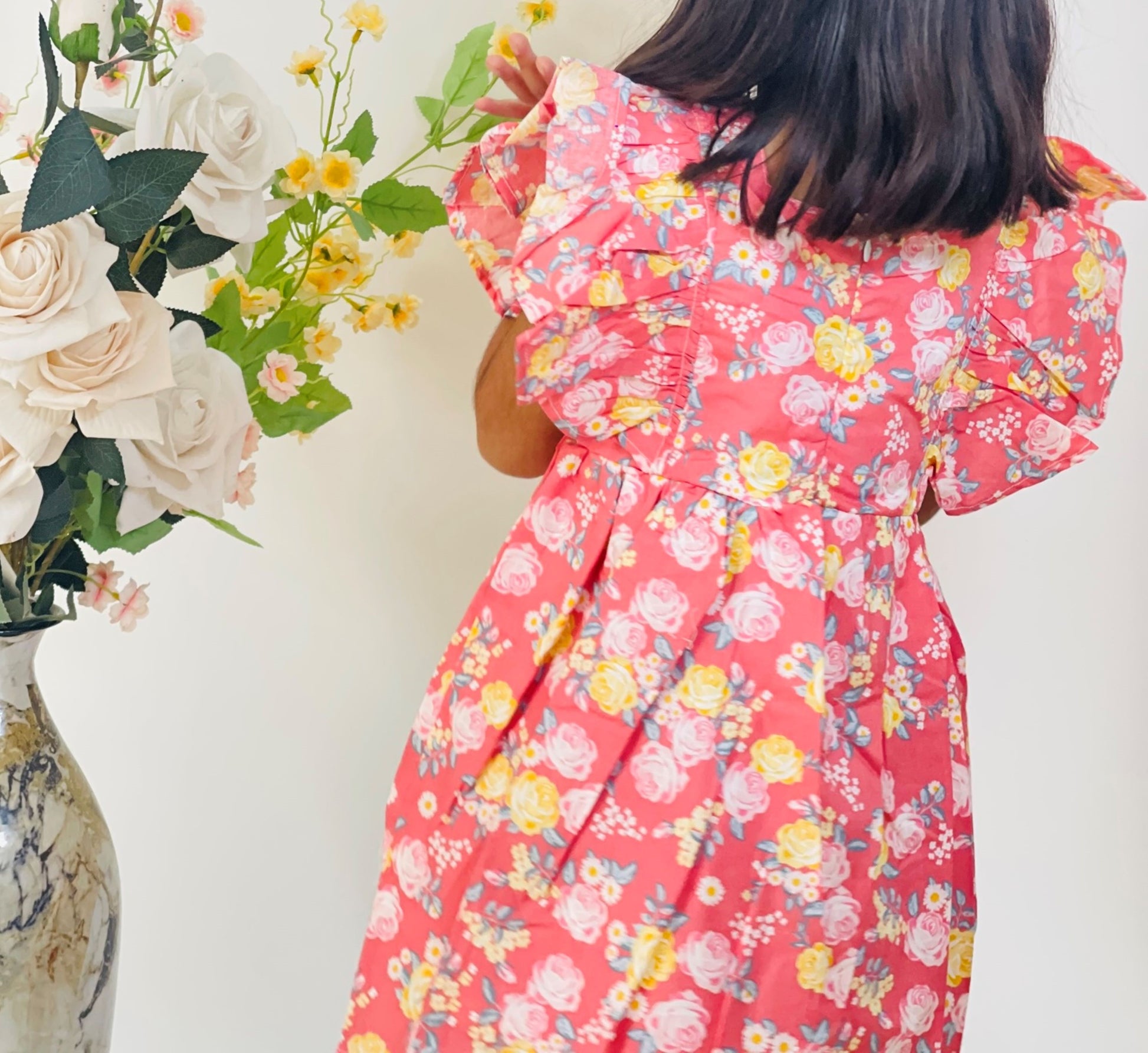 Let your little one bloom in style with this charming Rose Garden Flutter Sleeve Dress! Designed in a warm brick red base with an all-over floral print in soft pink, yellow, and white tones, this dress is perfect for sunny days and special outings.