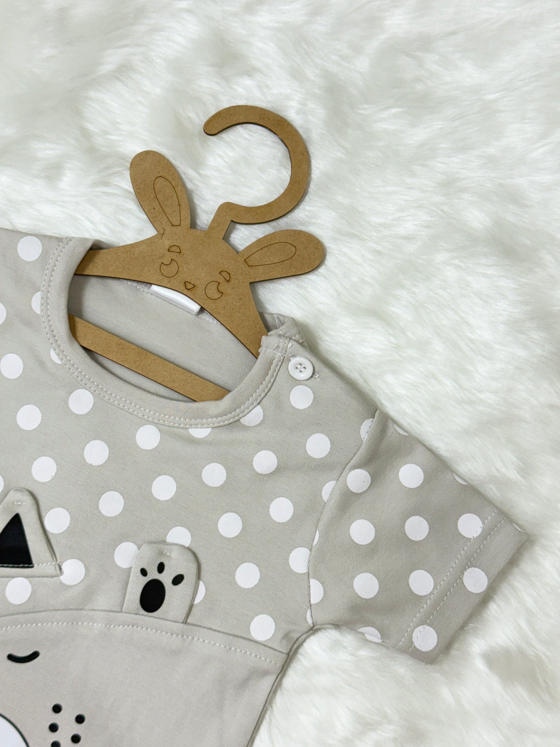 Designed with a round neckline and short sleeves, this romper features cheerful cartoon animal faces on the chest and front pockets, adding a dose of fun to your baby’s everyday wardrobe. The convenient front snap button closure makes dressing and diaper changes quick and fuss-free, perfect for busy parents on the go.