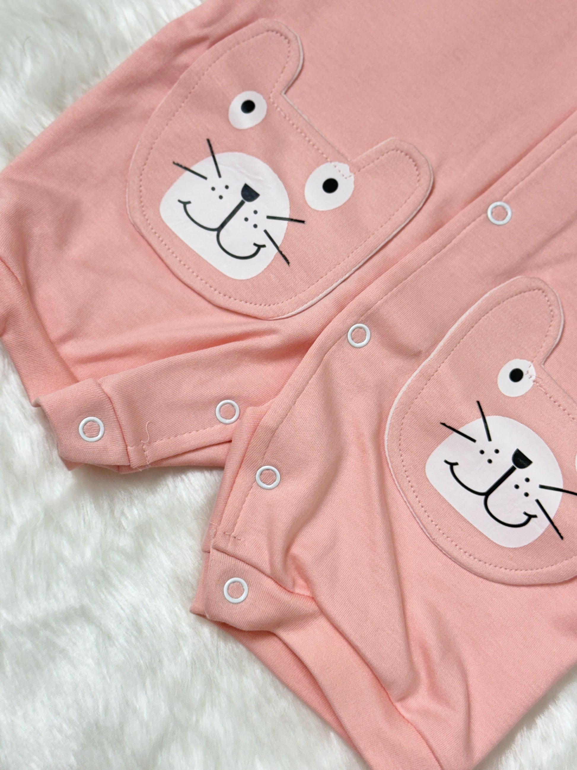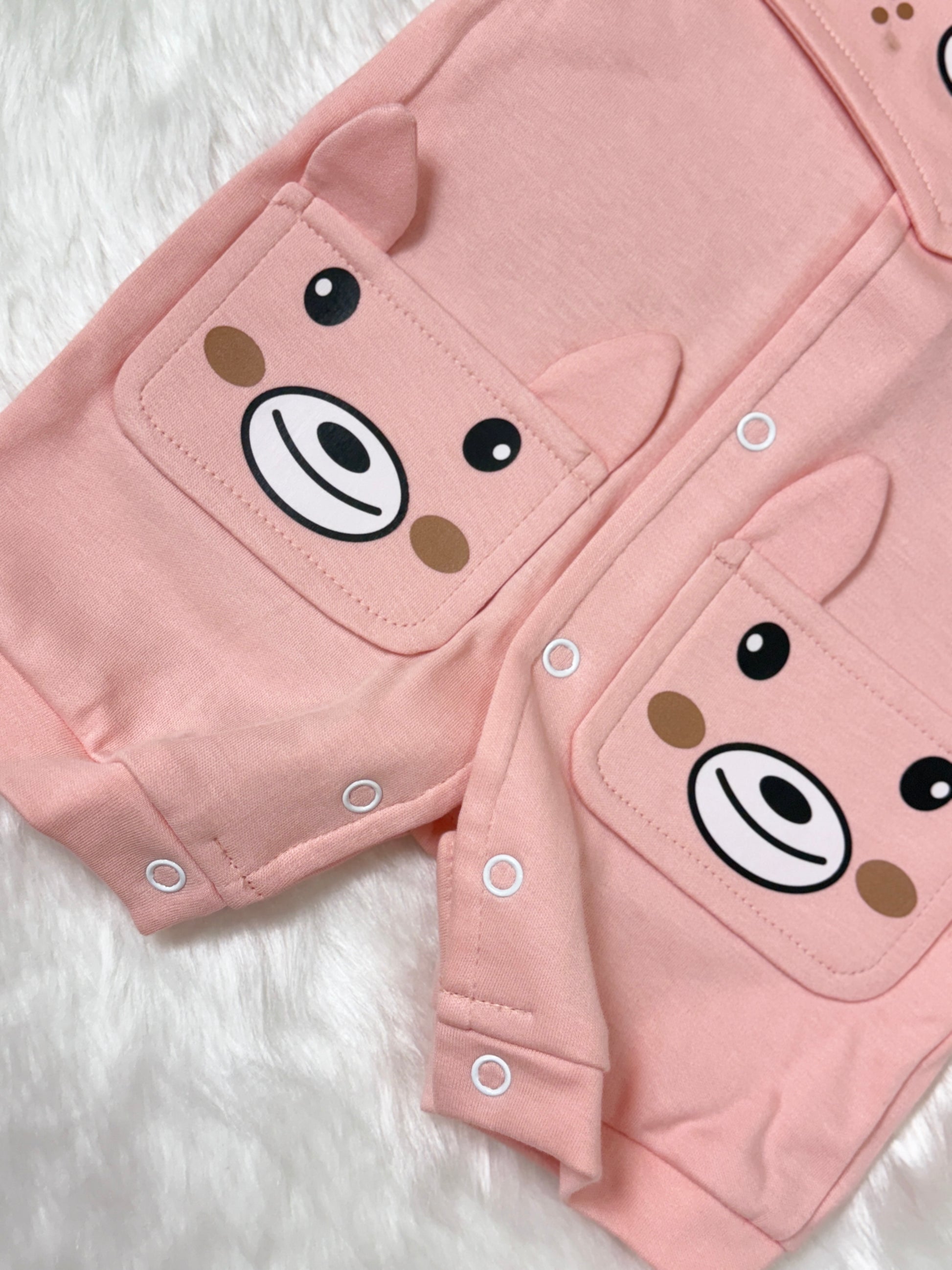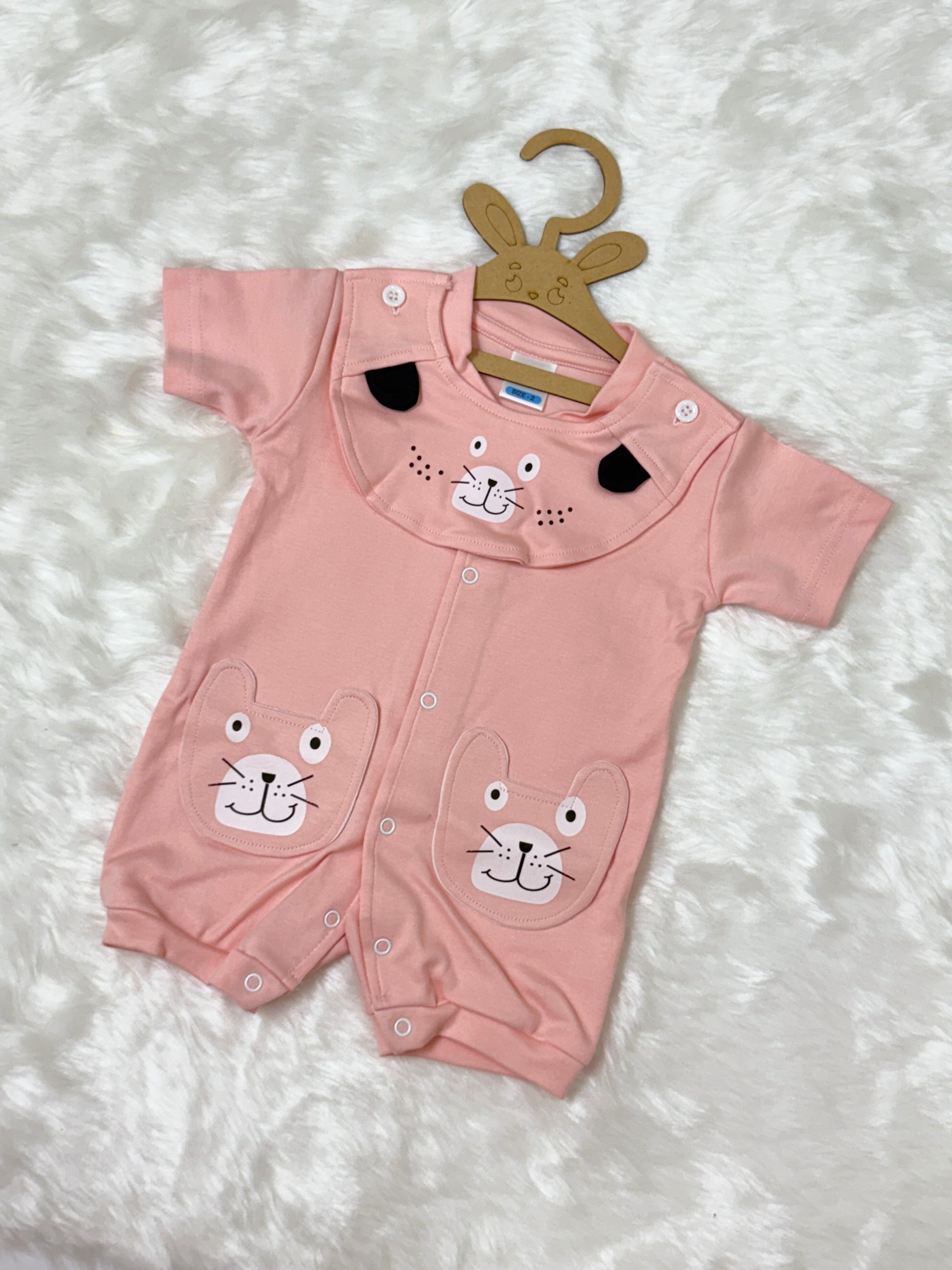 Designed with a round neckline and short sleeves, this romper features cheerful cartoon animal faces on the chest and front pockets, adding a dose of fun to your baby’s everyday wardrobe. The convenient front snap button closure makes dressing and diaper changes quick and fuss-free, perfect for busy parents on the go.