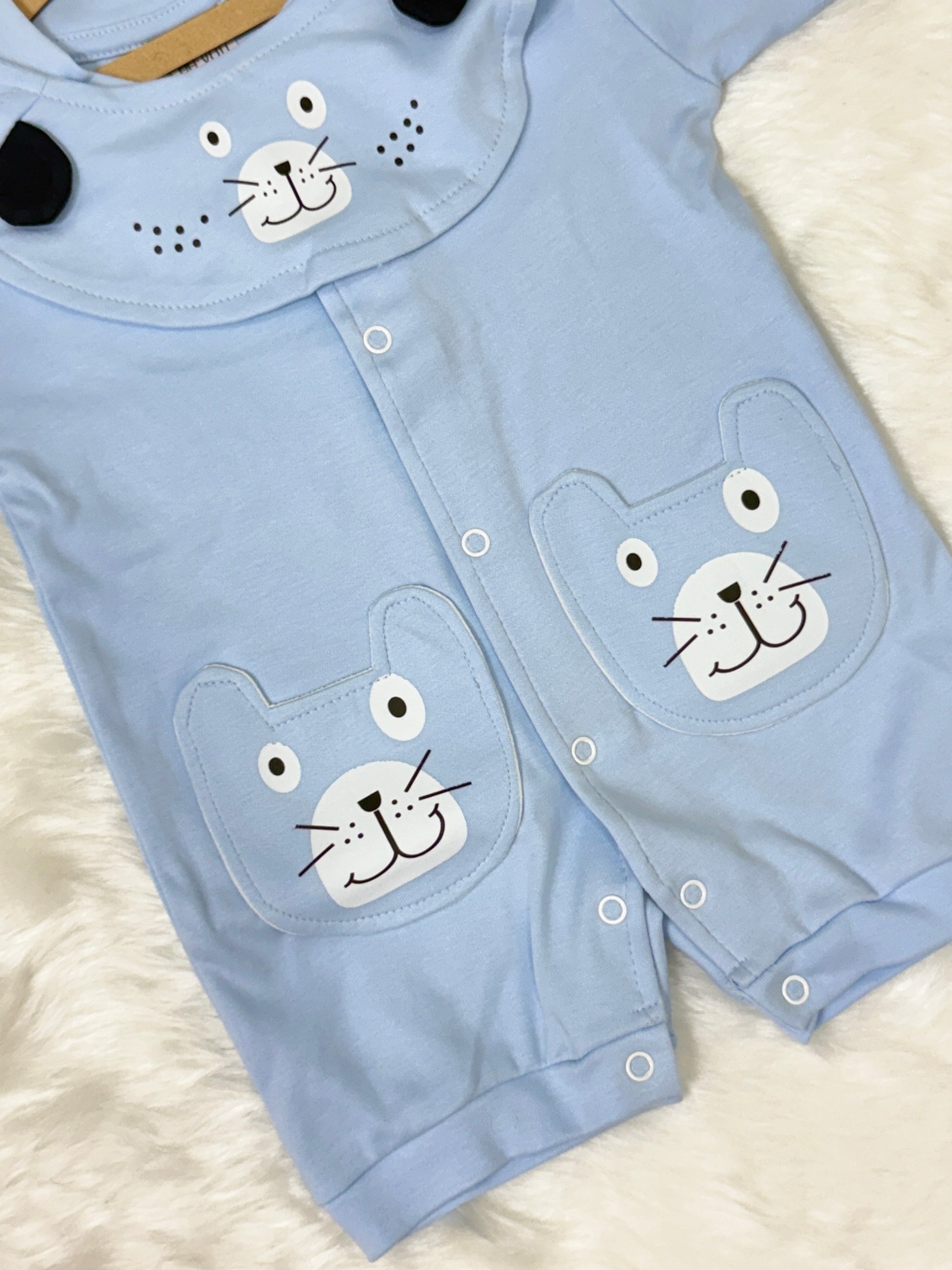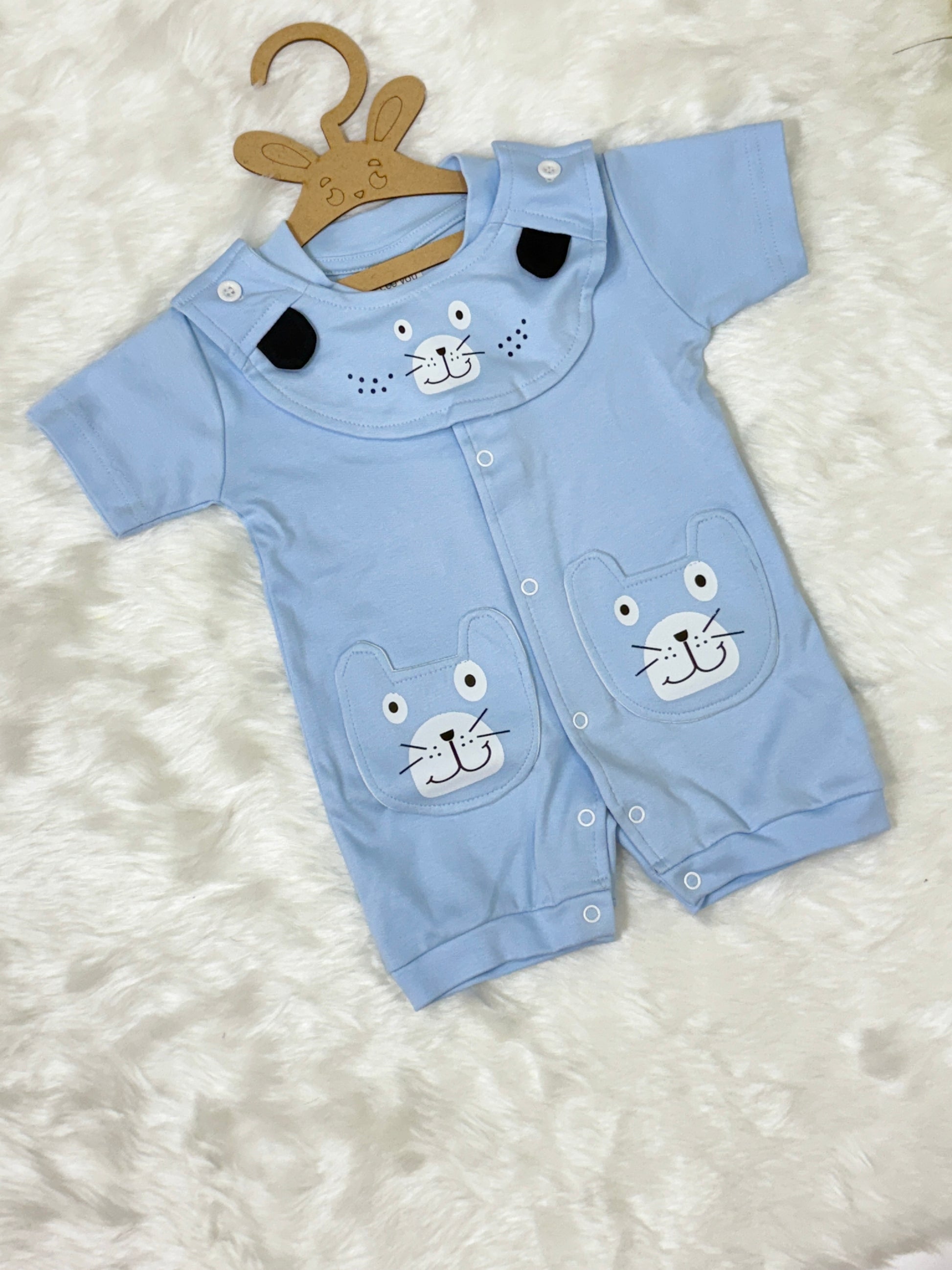 Designed with a round neckline and short sleeves, this romper features cheerful cartoon animal faces on the chest and front pockets, adding a dose of fun to your baby’s everyday wardrobe. The convenient front snap button closure makes dressing and diaper changes quick and fuss-free, perfect for busy parents on the go.