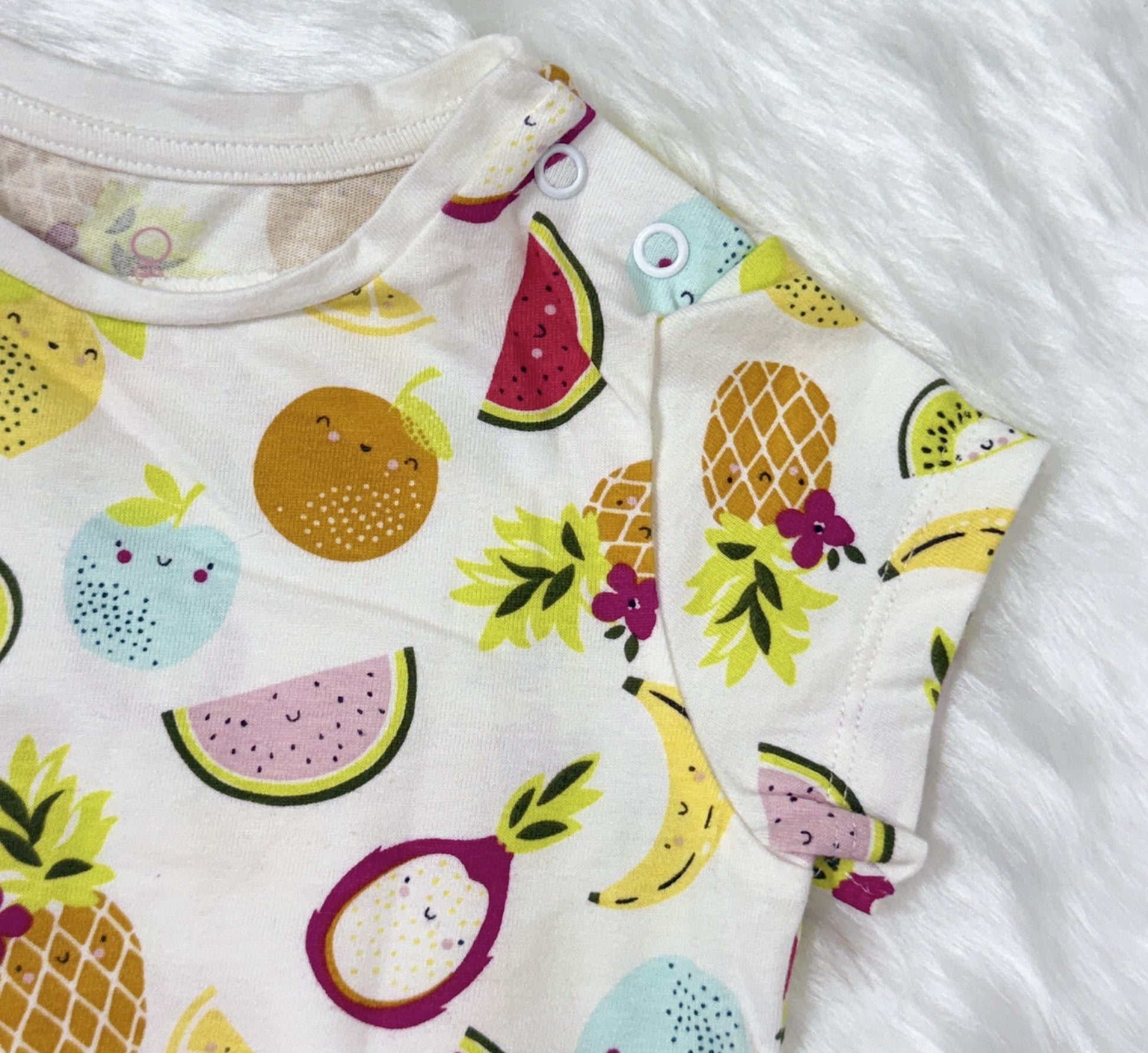 Add a splash of fruity fun to your little one’s wardrobe with this cheerful Fruit Print T-Shirt! Featuring adorable smiling watermelons, pineapples, bananas, and more in vibrant colors, this tee is full of tropical charm.
